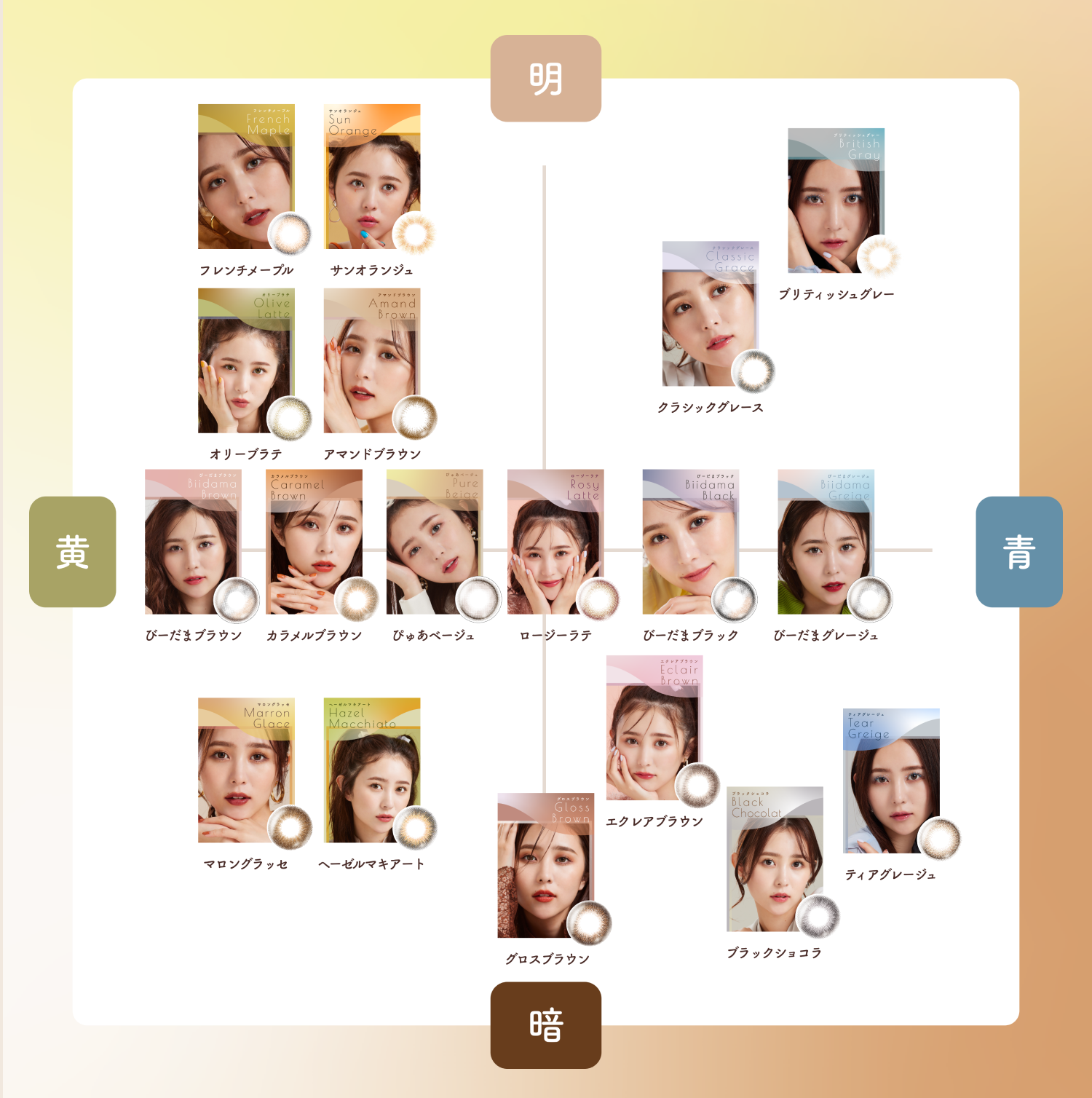 D I A | 14.4mm (ぴゅあベージュ、びーだまブラック、びーだまブラウン、びーだまグレージュ、クラシックグレース、 エクレアブラウン、グロスブラウン) 14.2mm (フレンチメープル、アマンドブラウン、カラメルブラウン、オリーブラテ、ロージーラテ、ティアグレージュ、 サンオランジュ、ブリティッシュグレー、ブラックショコラ、マロングラッセ、ヘーゼルマキアート) |