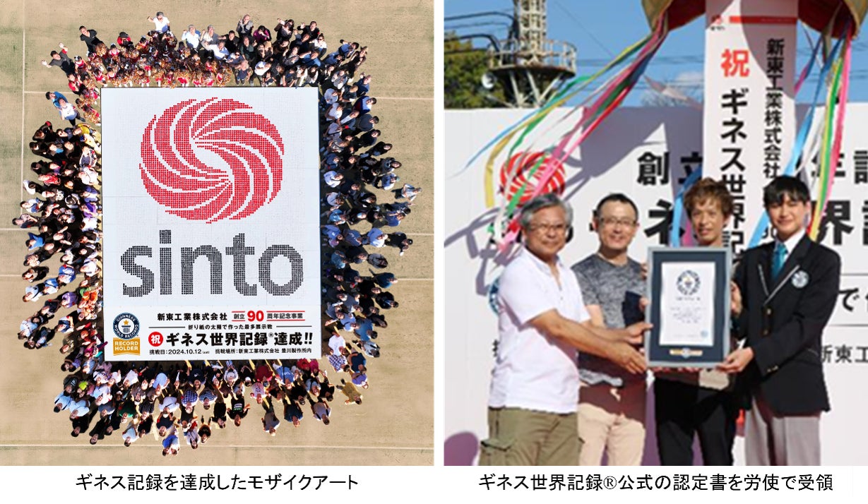 今回の挑戦は、10月12日に開催された創立90周年記念イベントの目玉の一つ「One Global Sintoで世界一に挑戦」として行われました。製作には折り紙10,388枚が使われ、全ての折り紙に100年を迎える10年後の自分や家族宛のメッセージや夢が書かれています。これらの折り紙で作った太陽で、横7.2m、高さ7.2mの当社シンボルマークを制作。見事、世界記録として認められました。