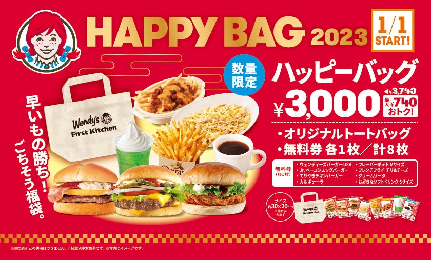 ウェンディーズ・ジャパン株式会社(代表取締役:紫関修 所在地:東京都新宿区)では、 2023年1月1日(日)より、ウェンディーズ・ファーストキッチン吉祥寺店など5店舗限定で、お食事券をセットにしたオリジナルの福袋′′ハッピーバッグ“を販売します。ウェンディーズ・ファースト キッチンのマスコットキャラクター・ウェンディーちゃんが描かれたトートバッグは、今しか手に入れることができない限定品です。 オリジナルのトートバッグとお食事券は、バーガー、パスタ、ポテトなど8種類がついていて、最大で740円お得にウェンディーズの商品をお楽しみいただけます。 ぜひゲットして、一年の始まりをハッピーにお迎えください!