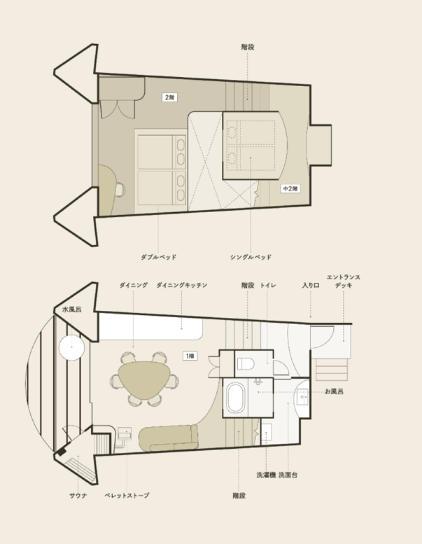 ・最大宿泊人数:6名(2F:ダブルベッド×2 中2階用追加寝具シングル×2)