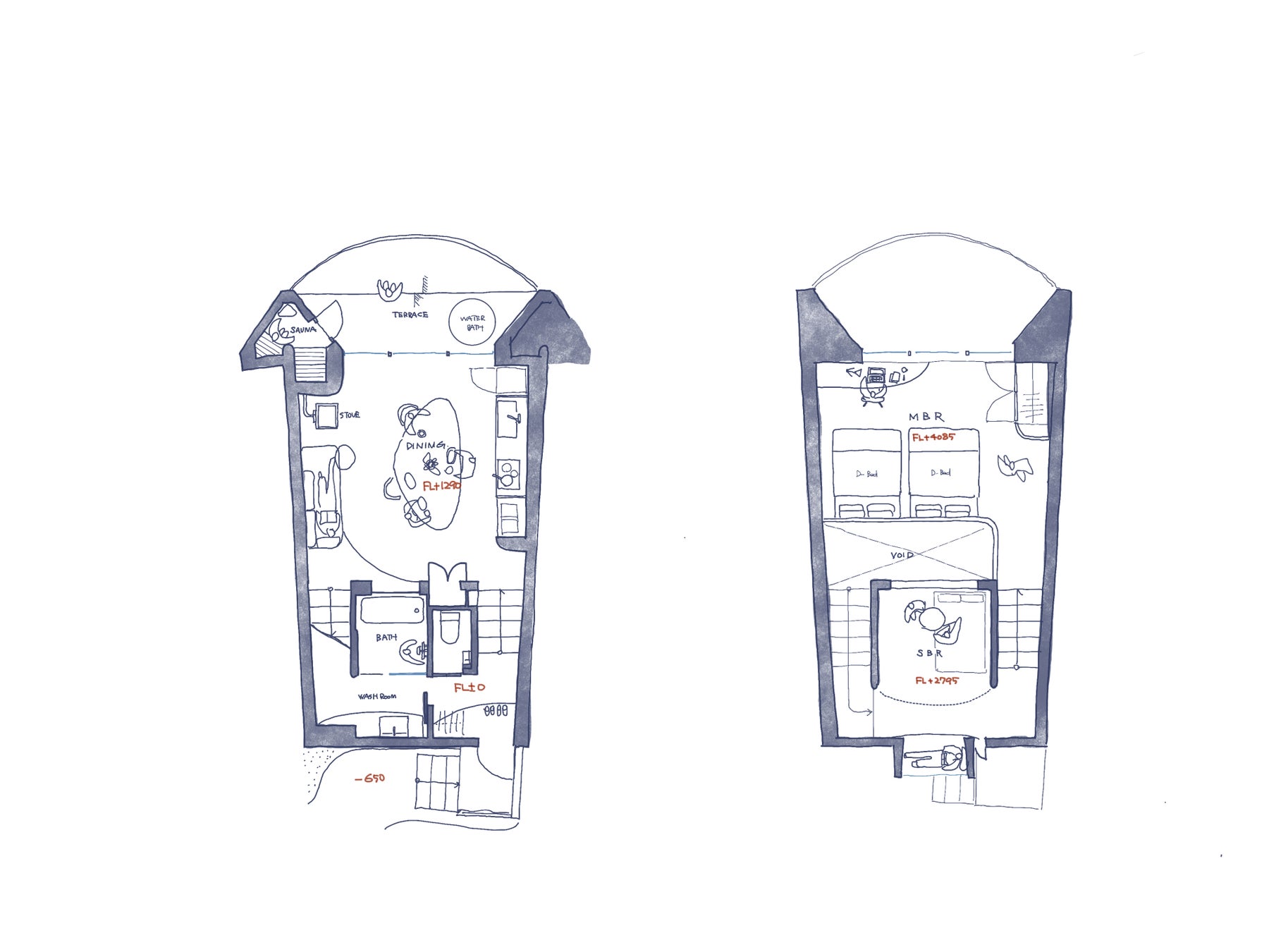 全棟最大6名まで宿泊可能な Largeタイプ(室内79.14㎡ +バルコニー 10.23㎡)とし、家族や友人との滞在でもゆったり過ごせるスケールを確保しました。 さらにプライベートサウナや愛犬同伴可の客室を用意し、滞在を特別なイベントではなく、日常の延長として無理なく続けられるものにします。
