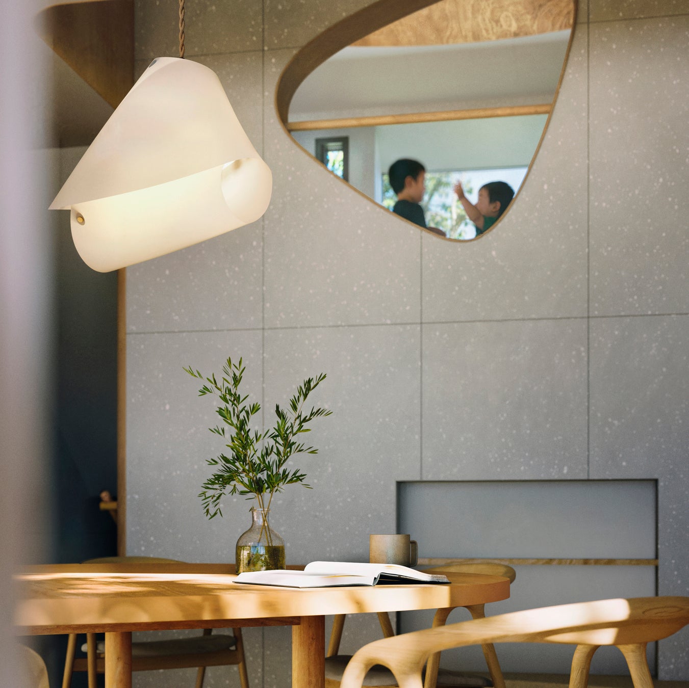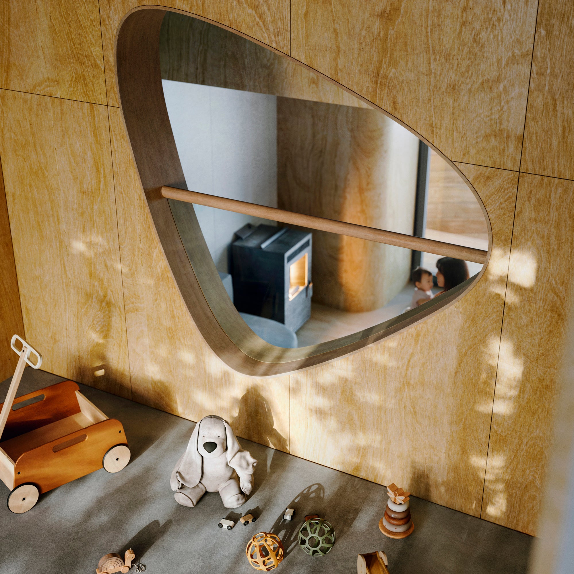 家の中の小さな上り下りが、移動そのものを「ハイキング」のような道中に変えます。壁で分断せず、高さで光や気配をにじませることで、互いを感じながら個の自由も守られる距離感を創出しました。 一歩進むたびに視点は更新され、遠景を捉える大開口や南からの光を拾う出窓など、フロアごとに異なる自然の表情と出会います。