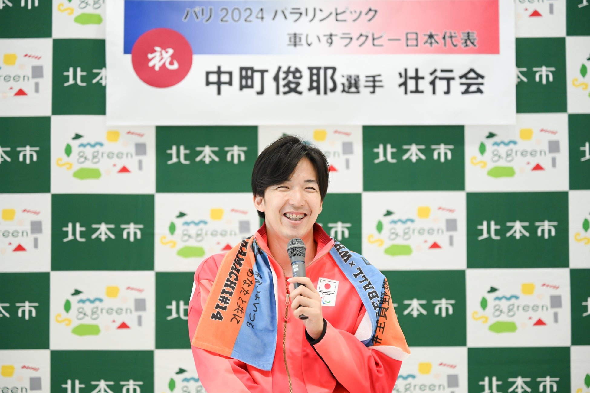 8月5日(月)に北本市役所で、パリ2024パラリンピックへ車いすラグビー日本代表として出場する北本市出身の中町俊耶選手の壮行会を開催しました。壮行会には、市民や関係者など100人を超える方々にご参加いただき、大盛況のうちに終了しました。