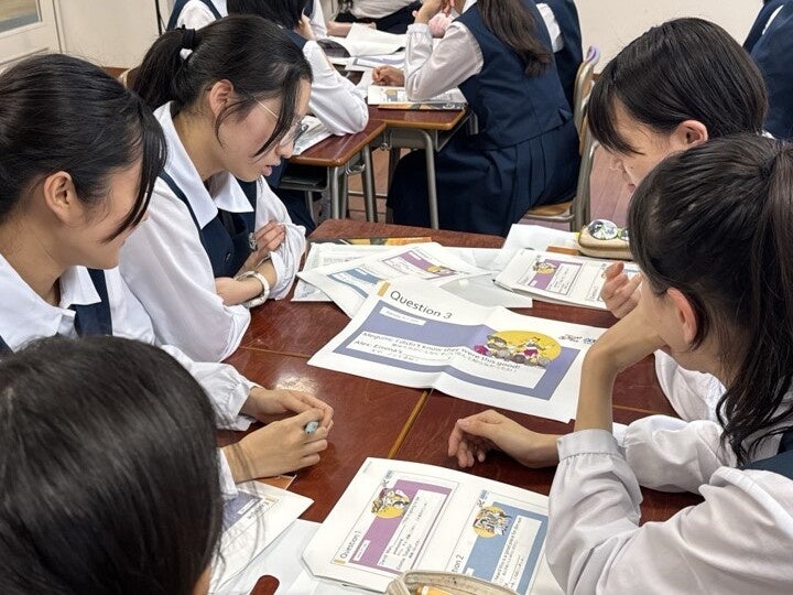 出前授業では、『ぶっちゃけ!英会話』に出演中のイーオン教師 ハバ先生が登壇しました。11月1日号紙面では過去10年の間に紹介された多くの会話表現のうち10個が紹介されていますが、出前授業では、そこから5つをピックアップして、クイズ形式で授業を行いました。聖心女子学院の生徒の皆さんは5人1グループ(全5グループ)となり、各グループで話し合いながら解答を考えました。それぞれ解答を発表していただき、答え合わせと、同様に使える表現をハバ先生が紹介をしました。生徒の皆さんからもたくさんのアイディアが出て、「教科書にはあまり出ないけれど、海外のティーンがよく使うリアルな英語表現を紹介する」という『ぶっちゃけ!英会話』のコンセプトに則りながら、とても盛り上がった楽しい授業となりました。