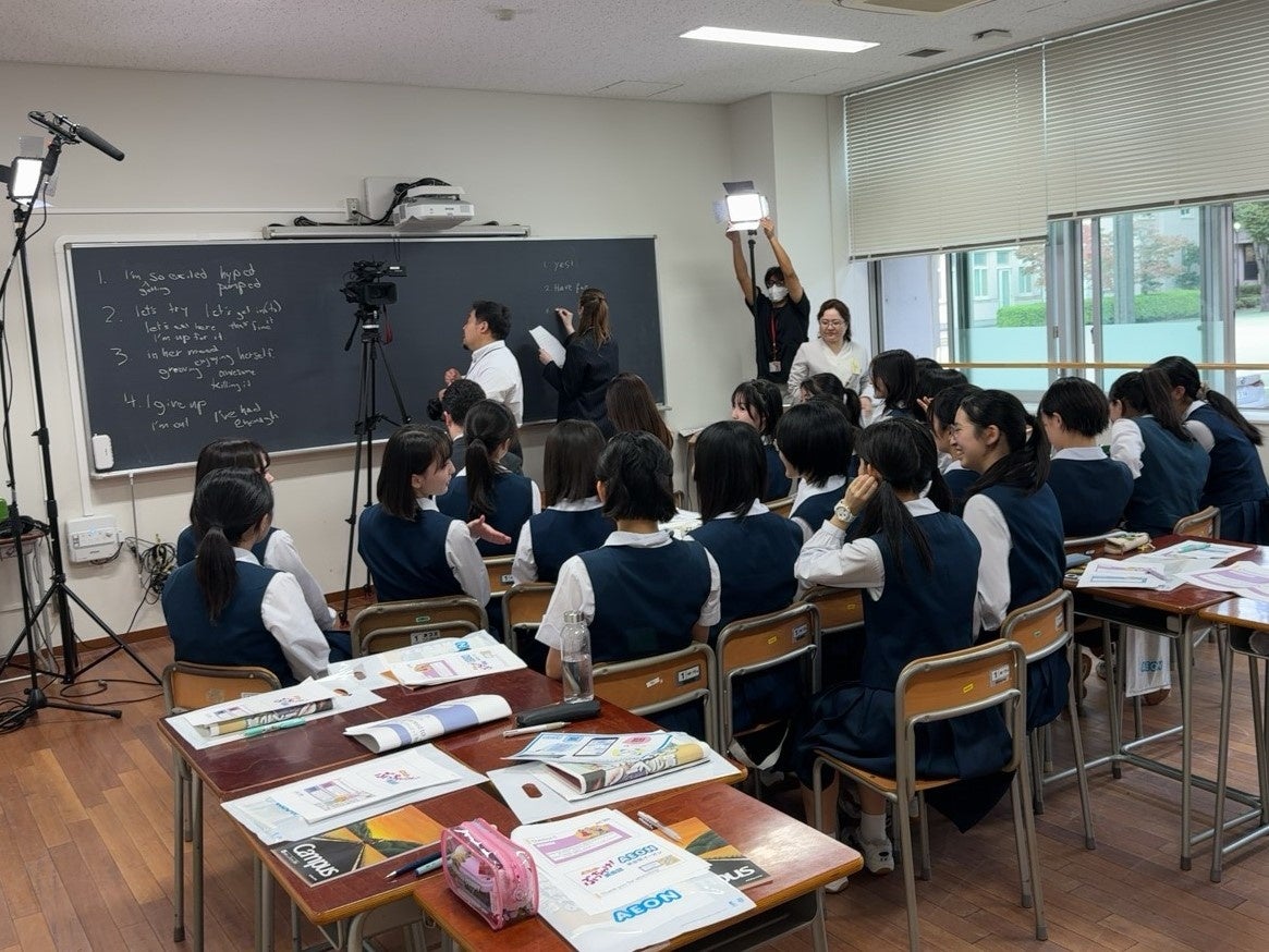 聖心女子学院の生徒の皆さんにもご参加いただき『ぶっちゃけ!英会話』の動画撮影を行いました。今回収録したカットは、動画のオープニング・クロージング部分と、紙面で紹介したキーフレーズの意味や使い方を解説する部分です。クロージングでは、イーオン教師と生徒の皆さんが英語で掛け合いをするなど、楽しく和気あいあいとした雰囲気で撮影が進みました。この動画は、10月31日(木)より公開されています。