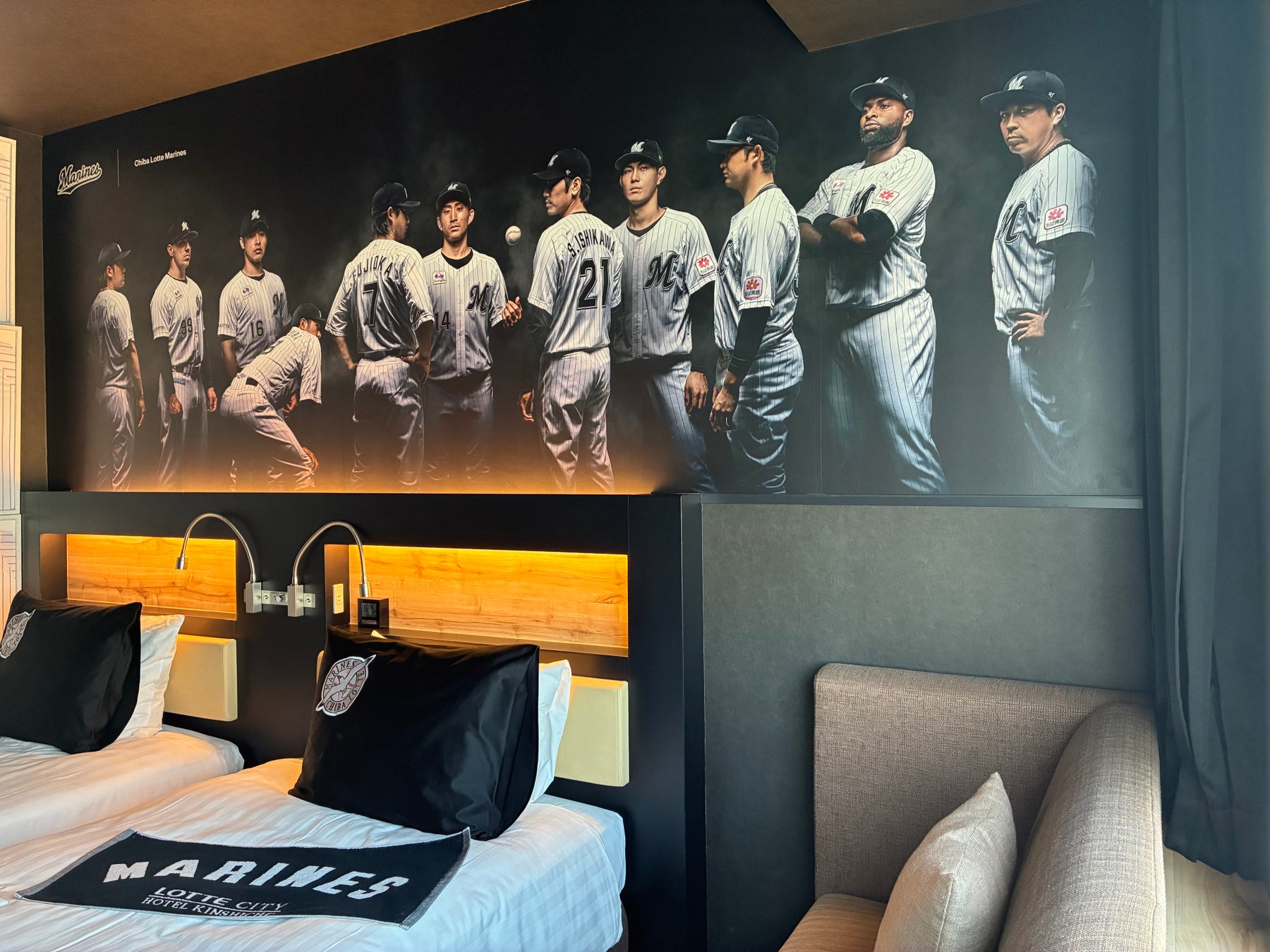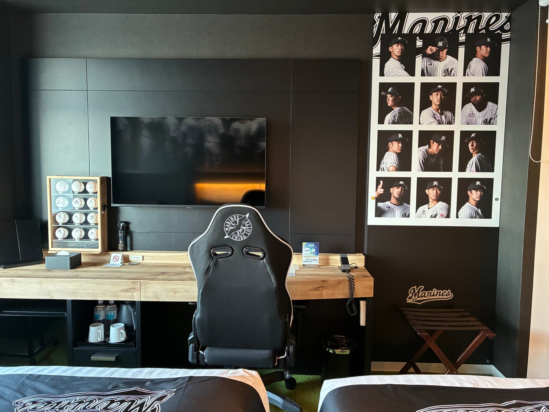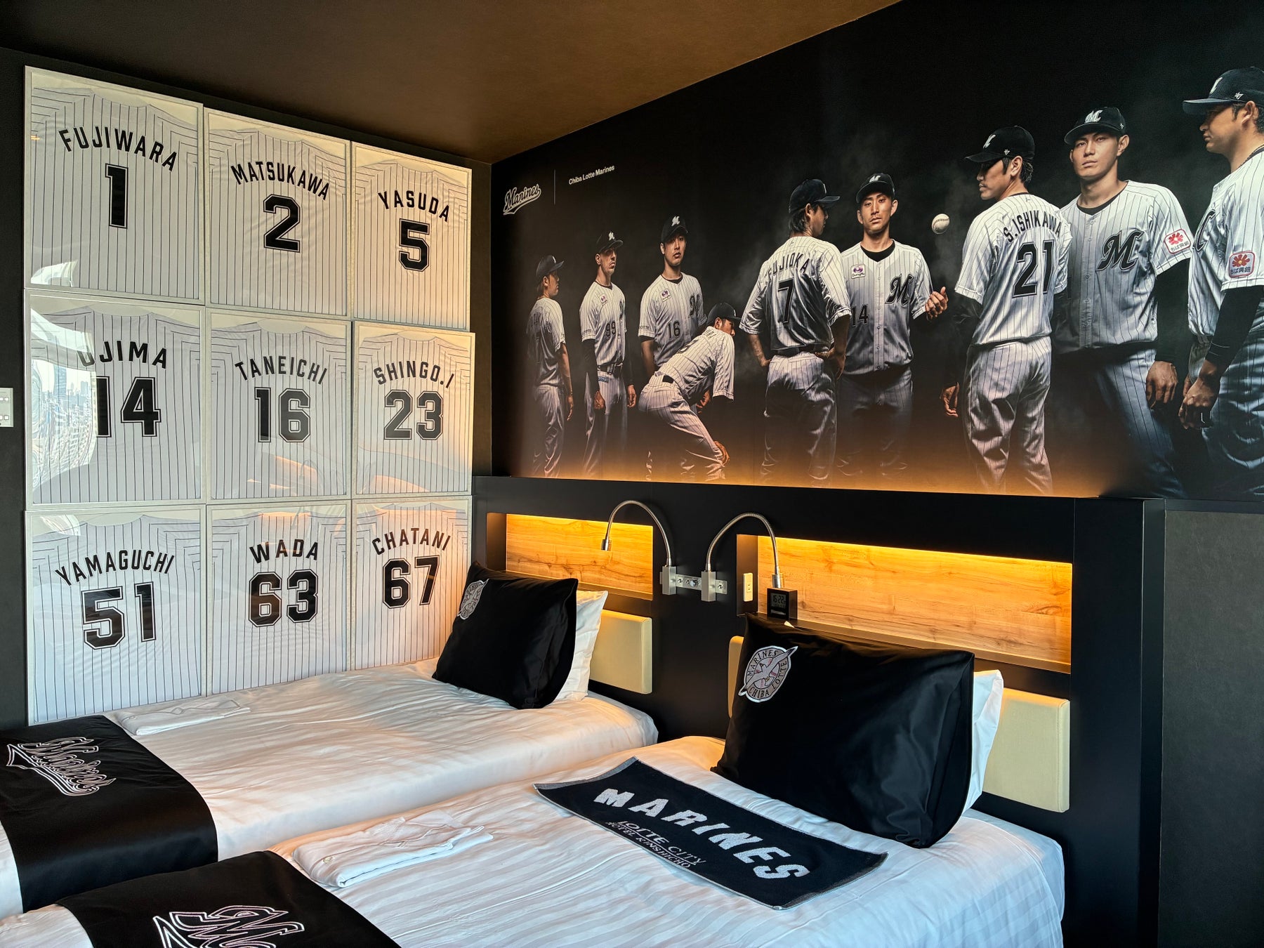 マリーンズの2025年チームスローガンは「その全ては、勝つために。」今回のリニューアルで、選手の熱気と闘志がますます身近に感じられるお部屋になりました。ヘッドボード上部に広がるのは、マリーンズ選手の凛々しい姿。ベッドに寝そべりながら、選手の精悍な表情を眺めることもできます。ベッド横には、選手の名前と背番号が記されたユニホームを飾りました。