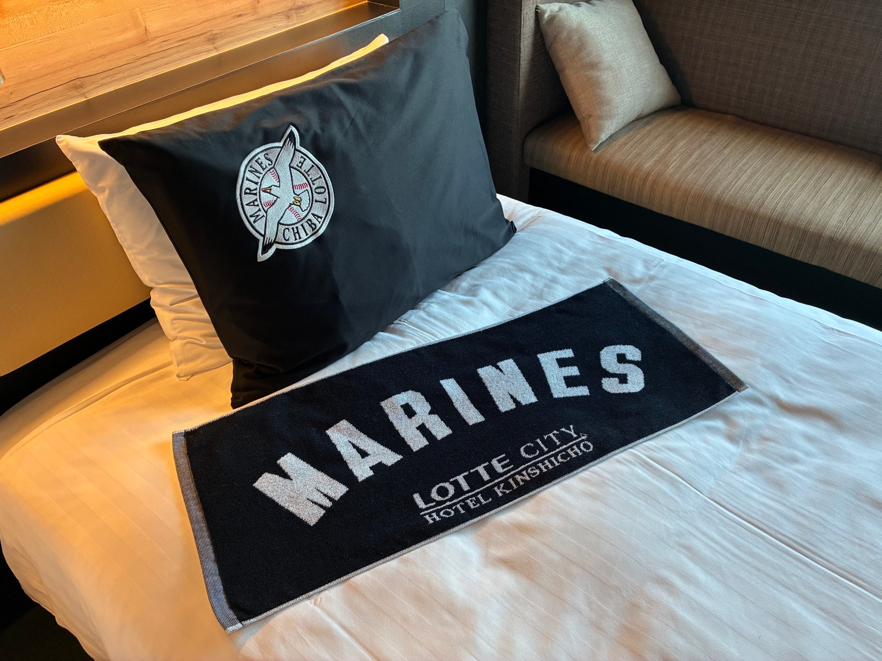 お部屋にご用意いたしました「マリーンズコラボタオル」はお持ち帰りいただけます。