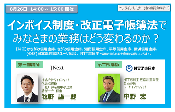 NTT東日本 神奈川事業部は、かながわ信用金庫・さがみ信用金庫・湘南信用金庫、平塚信用金庫、横浜信用金庫、日本電信電話ユーザ協会と共に、インボイス制度と改正電子帳簿法への対応に関するオンラインセミナーを開催します。