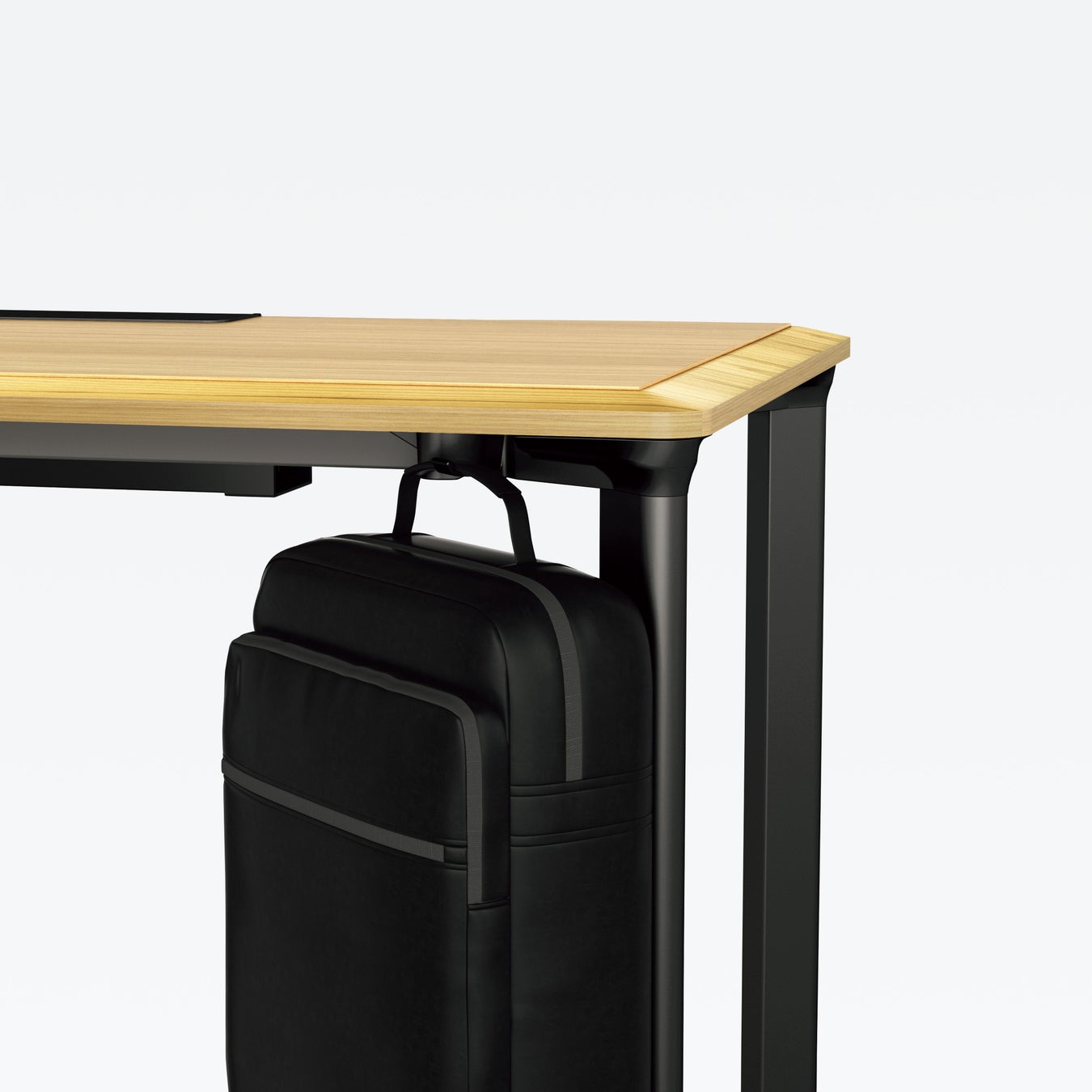 デスク周りがスッキリする取り外し可能な樹脂製配線フタや、各種アクセサリー取り付け用40mm幅スリット、脚部にバッグやリュックを掛けることができる荷掛けフックなど、使い勝手を高める機能を装備しています。