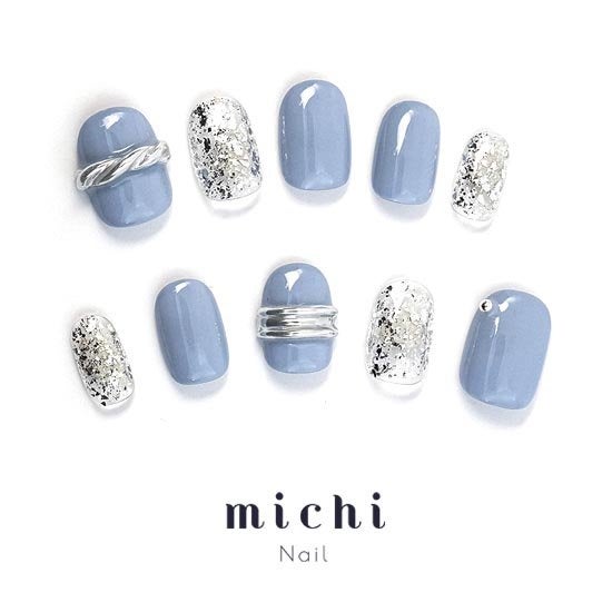 スモーキーなブルーとシルバーは相性抜群。統一感がおしゃれです。雪のようなシルバーフレークが冬らしく、メンズライクなファッションにも似合うデザインです。