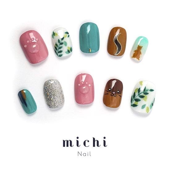 栄区を東西に流れるシンボルリバー、いたち川のマスコットキャラクター「タッチーくん」とミチネイルのコラボチップです!コラボチップAと比べるとピンクやグリーンが元気な印象のデザインです。かわいいタッチーくんを存分に活かしたとにかくかわいいデザインです。