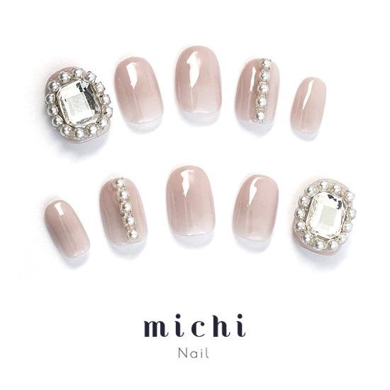 透け感のあるピンクベージュは肌なじみがよく、品のある印象を与えます。大きめのビジューが上品さにゴージャスさを加えてくれます。結婚式のお呼ばれなどにいかがでしょうか。