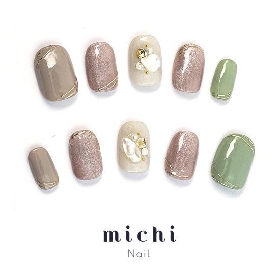 角度を変えるたびに輝きが変わるマグネットジェルを使った、上品デザインです。真ん中のシェルとスタッズがポイントです。スモーキーグリーンの差し色がおしゃれさを引きたてています。