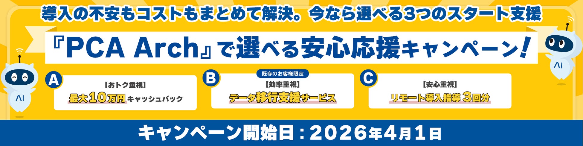 AI技術を活用し、 財務経理・人事労務・販売管理をワンストップでサポートする『PCA Arch』をはじめ、クラウド型基幹業務システムを開発・販売するピー・シー・エー株式会社(代表取締役社長:佐藤文昭 本社:東京都千代田区 プライム銘柄コード9629 以下:PCA)は、企業のバックオフィス業務のクラウド移行およびDX化を支援するため、『PCA Arch × PCAクラウド 選べる安心応援キャンペーン』を2026年4月1日(水)から実施することをお知らせします。