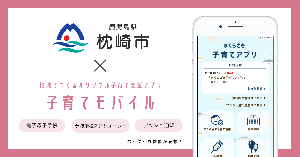妊婦・子育て家庭に寄り添う「伴走型相談支援」のより一層の充実を図るため、鹿児島県内5自治体(鹿屋市・日置市・いちき串木野市・志布志市・南種子町)でも取り入れられている 子育て支援アプリ「子育てモバイル」を導入する運びとなりました。枕崎市オリジナルのデザインを施し、子育て支援アプリ「まくらざき子育てアプリ」として提供いたします。