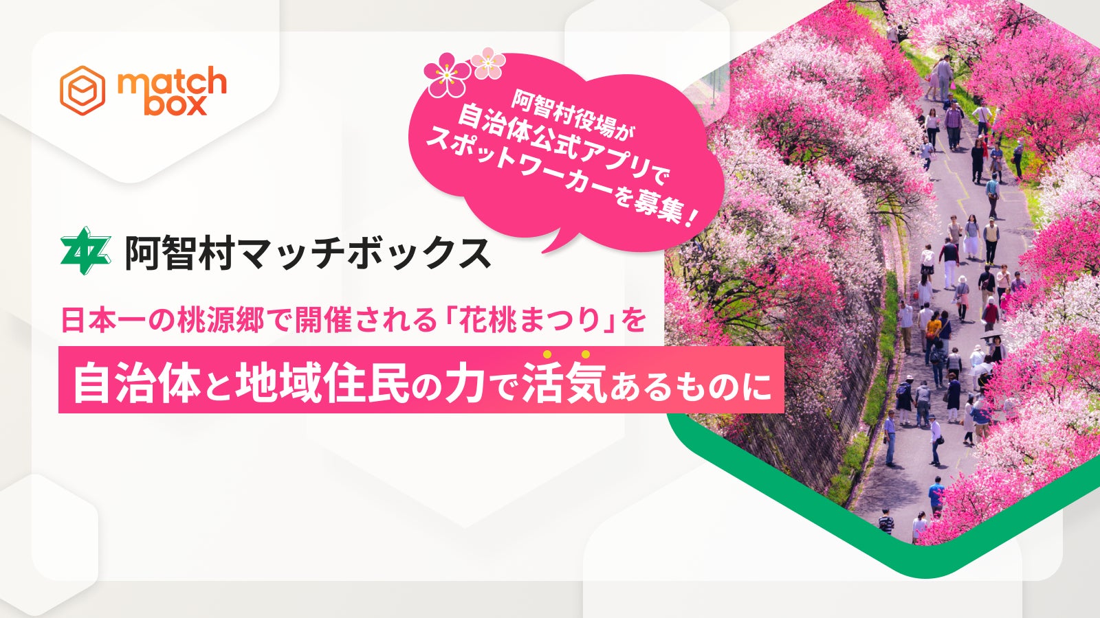 これまで「阿智村マッチボックス」は、地域の事業者の人材募集に利用されておりましたが、今回は自治体が「阿智村マッチボックス」を自ら活用し、自治体主催で開催されるイベント「花桃まつり」のスタッフを募集します。阿智村としての求人掲載は今回が初めてです。