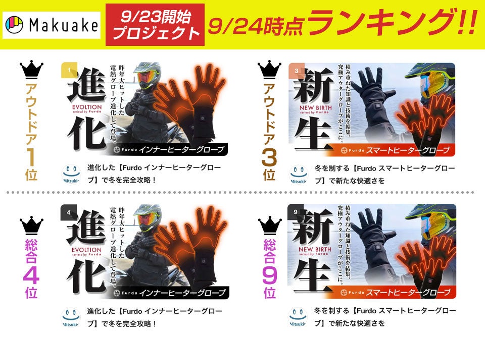 また、同時進行中の「Furdo インナーヒーターグローブ」も素晴らしい成果を収めており、アウトドアランキングで1位、総合ランキングでは4位に入賞しました。この2つの製品の同時ランクインは、皆様の温かいご支援があってこそのものです。