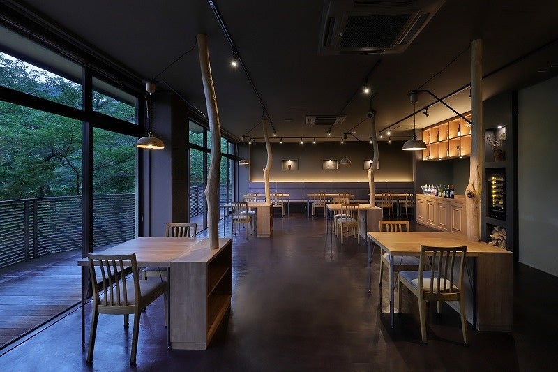 山形の風土を、森の音では現代的にアレンジを加え随所に表現しています。レストラン「森の音dining」は、山形の自然文化や地域との共生を目指したレストランとして今年2月にリニューアル。提供するお料理・お飲み物からインテリアデザインまで地元素材にこだわり、より山形の自然を五感で感じていただける空間に仕上げています。秋になると窓からはほんのり茜色に色づいた森の紅葉もご覧いただけます。