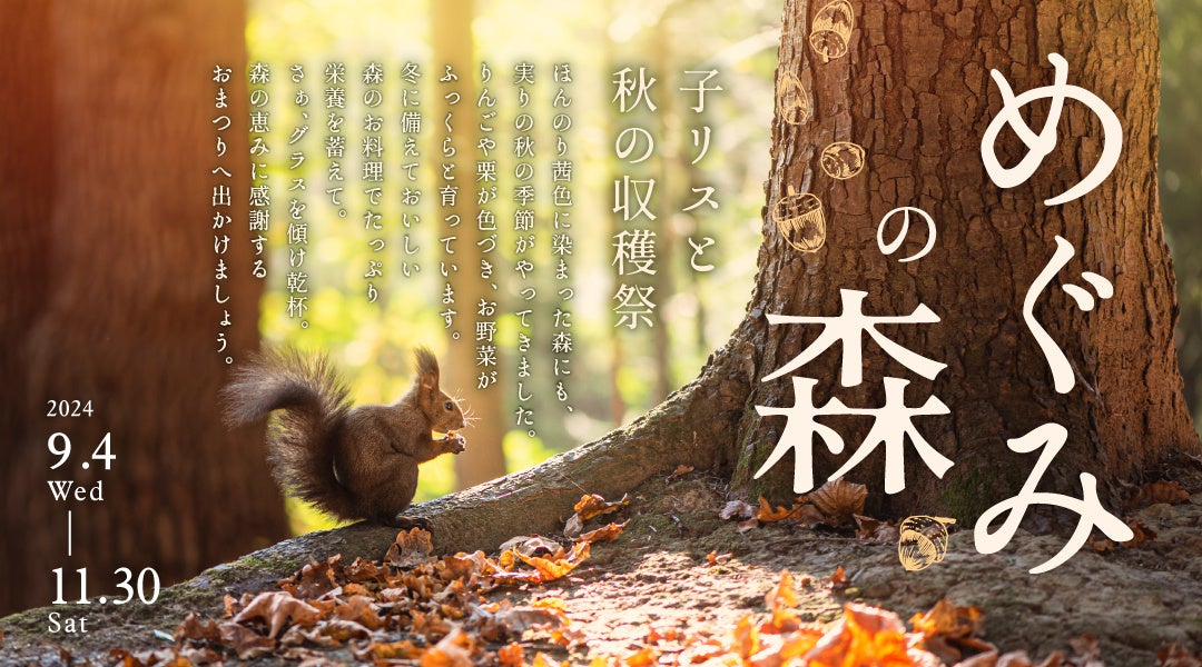 株式会社古窯ホールディングスのグループ会社 株式会社リード(本社:山形県上山市、代表取締役社長:佐藤 太一)が運営する、かみのやま温泉 おやど森の音(以下、森の音)は、秋イベント「めぐみの森」を2024年9月4日(水)~11月30日(土)の期間限定で開催いたします。同イベントのメイン企画では、「森の恵みを愉しむ」サスティナブルディナーコース「子リスと秋の収穫祭」を提供いたします。