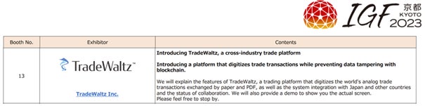「この度、国連IGFならびにICC関連イベントへ出展・講演の機会を頂きました皆様に感謝申し上げます。トレードワルツは日本の貿易実務者の業務が少しでも効率化できるよう、ブロックチェーン上で産業・国境をまたぐ手続きの電子化、データ流通にチャレンジしていますが、政府が目指すDFFTの実現に対しても、何らかお役立ち出来ていたなら幸いです。今後も貿易の未来をつくるために、私たちは一歩ずつ歩みを進めてまいります。」