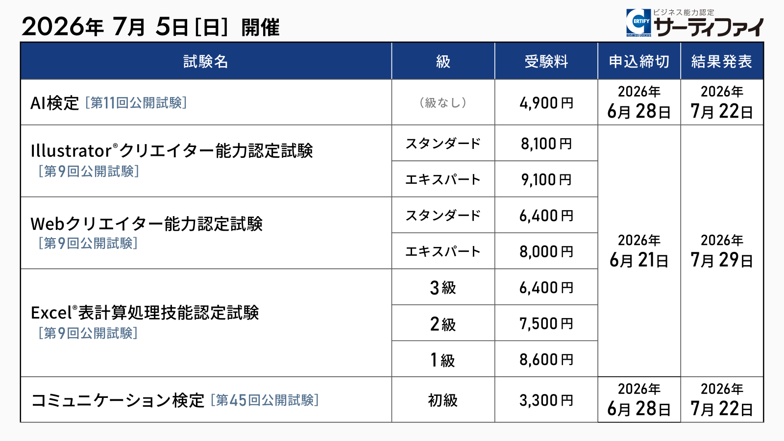 株式会社サーティファイ(本社:東京都中央区、代表取締役:瀧澤茂、以下「サーティファイ」)は、2026年7月5日(日)に開催する「AI検定」「Illustrator®クリエイター能力認定試験」「Webクリエイター能力認定試験」「Excel®表計算処理技能認定試験」「コミュニケーション検定」の公開試験の申込受付を2026年4月21日より開始しました。
