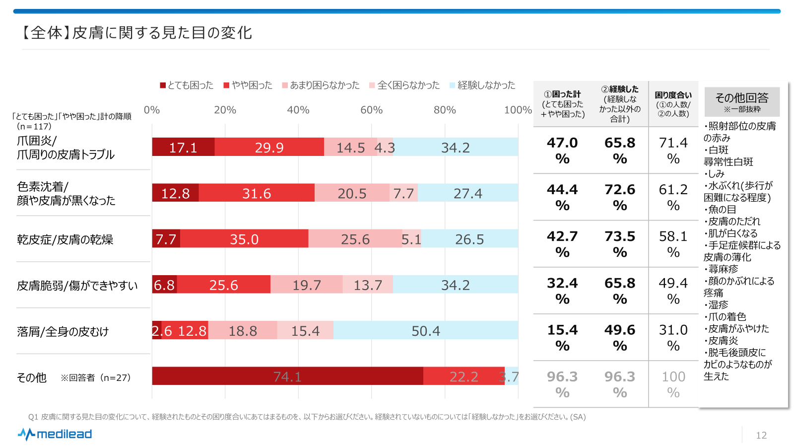 〈図4〉皮膚に関する変化:「爪囲炎/爪周りの皮膚トラブル」により「とても困った」、「やや困った」と回答した方は47.0%で、「爪囲炎/爪周りの皮膚トラブル」を経験した方の中では71.4%の方が困っていると回答した。