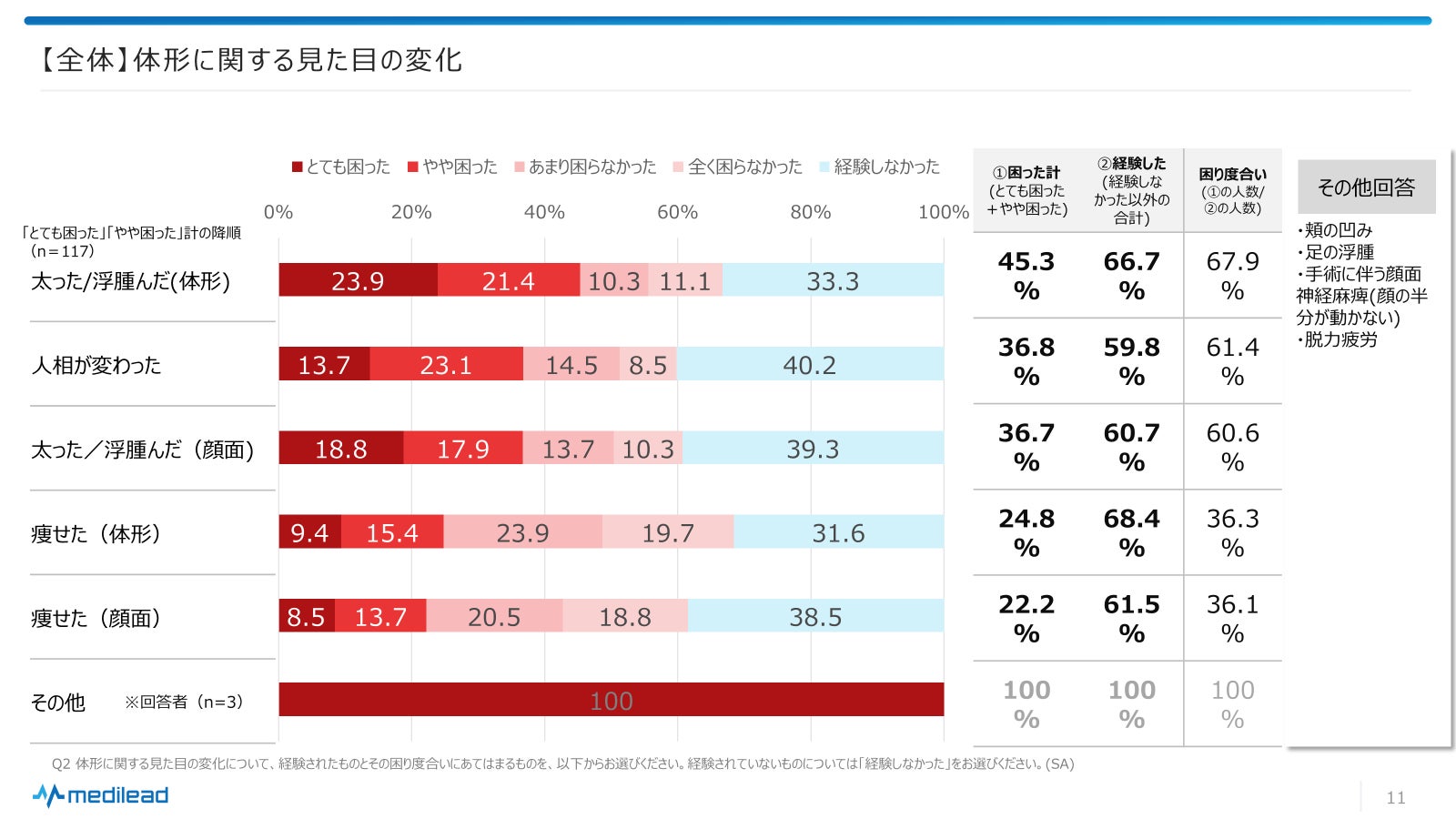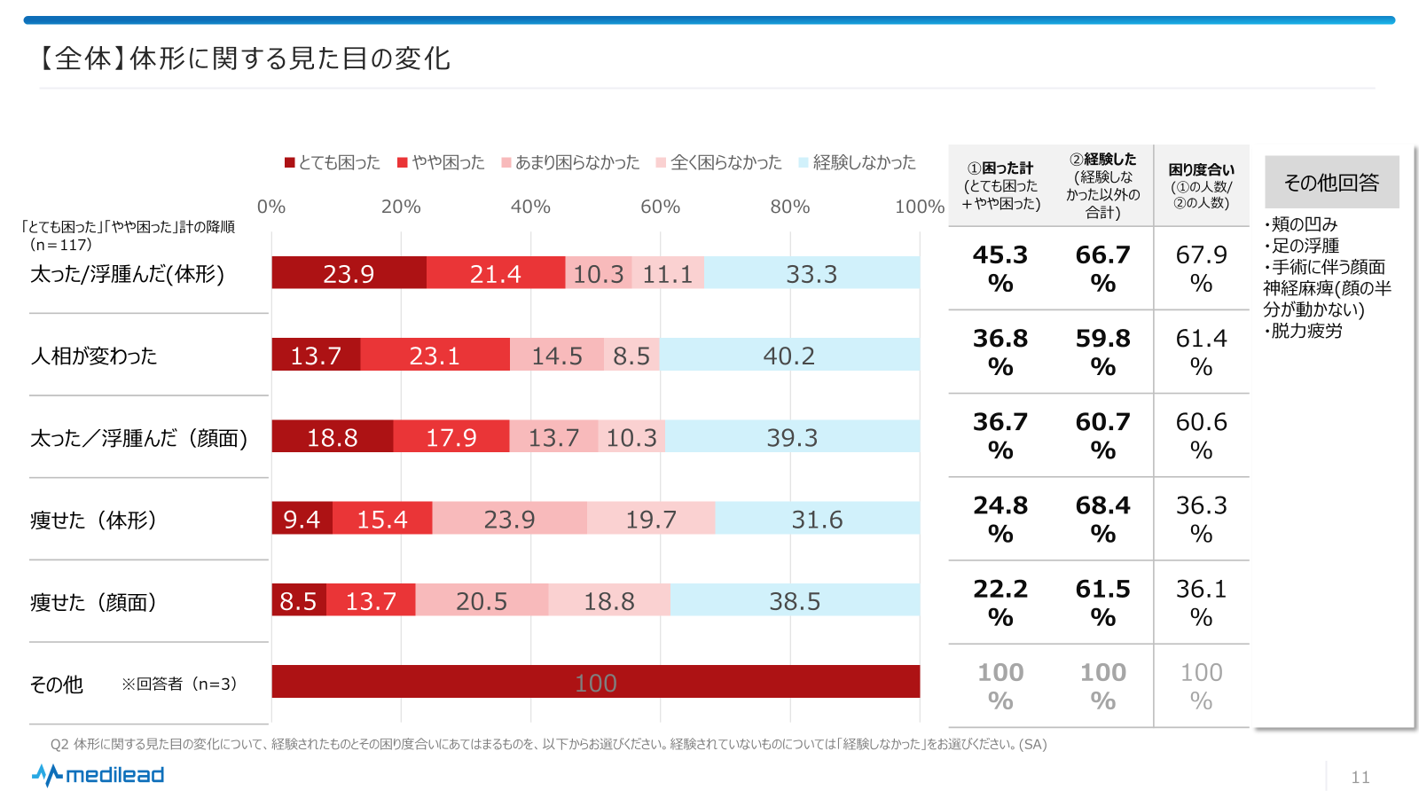 患者さんの体験談からは、見た目の変化が日常生活に与える影響の深刻さが浮き彫りとなっています。これらの変化に対する患者さんの困り度合いや精神的な苦痛は、医療提供者や支援者にとって重要な考慮事項です。治療の物理的な側面に加えて、患者さんの精神的な健康と生活の質を支えるための継続的、包括的なケアが必要であることを、改めて認識しました。