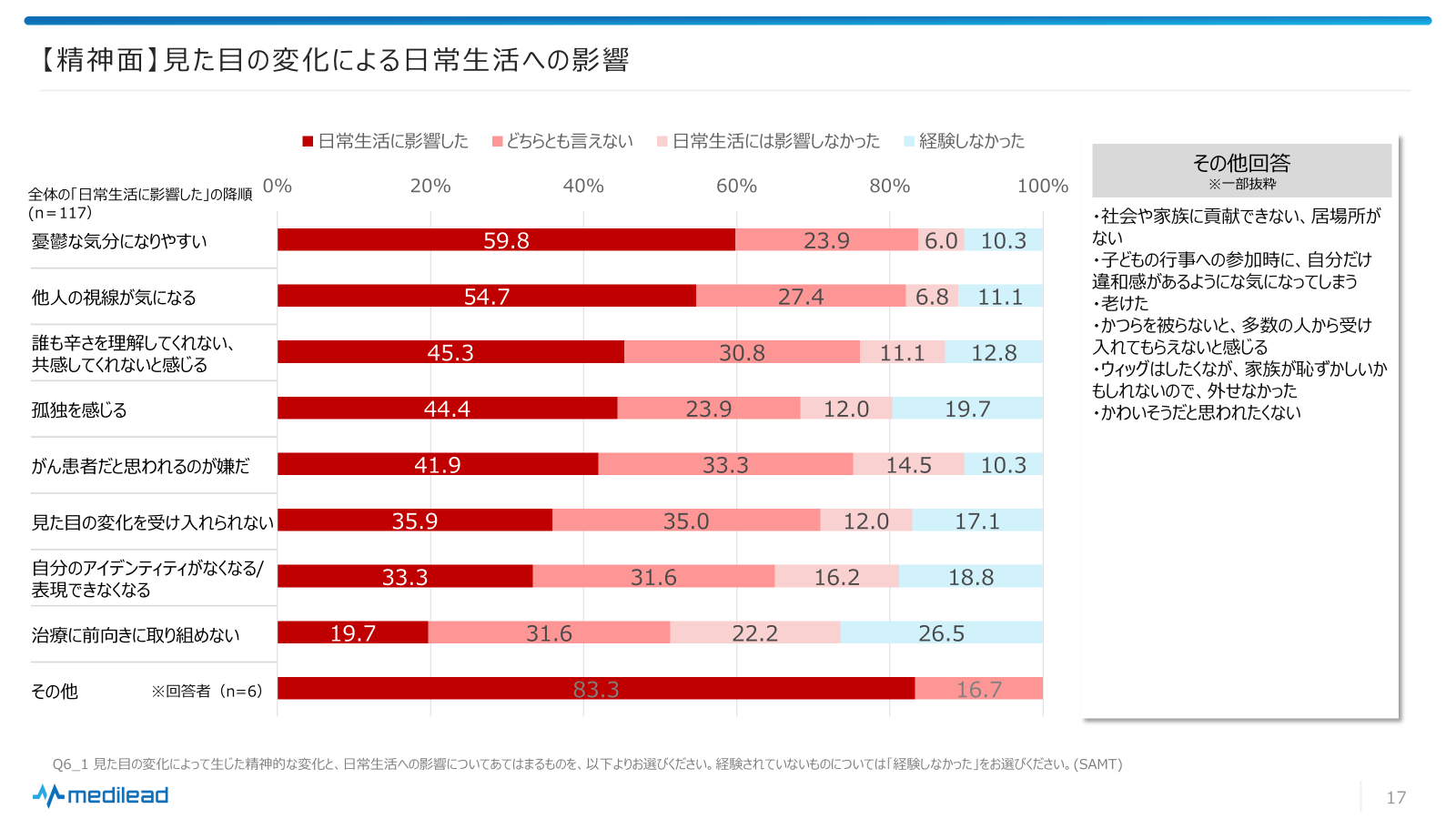 ・見た目の変化による日常生活への影響:「憂鬱な気分になりやすい」について59.8%の方が「日常生活に影響した」と回答した。〈図7〉