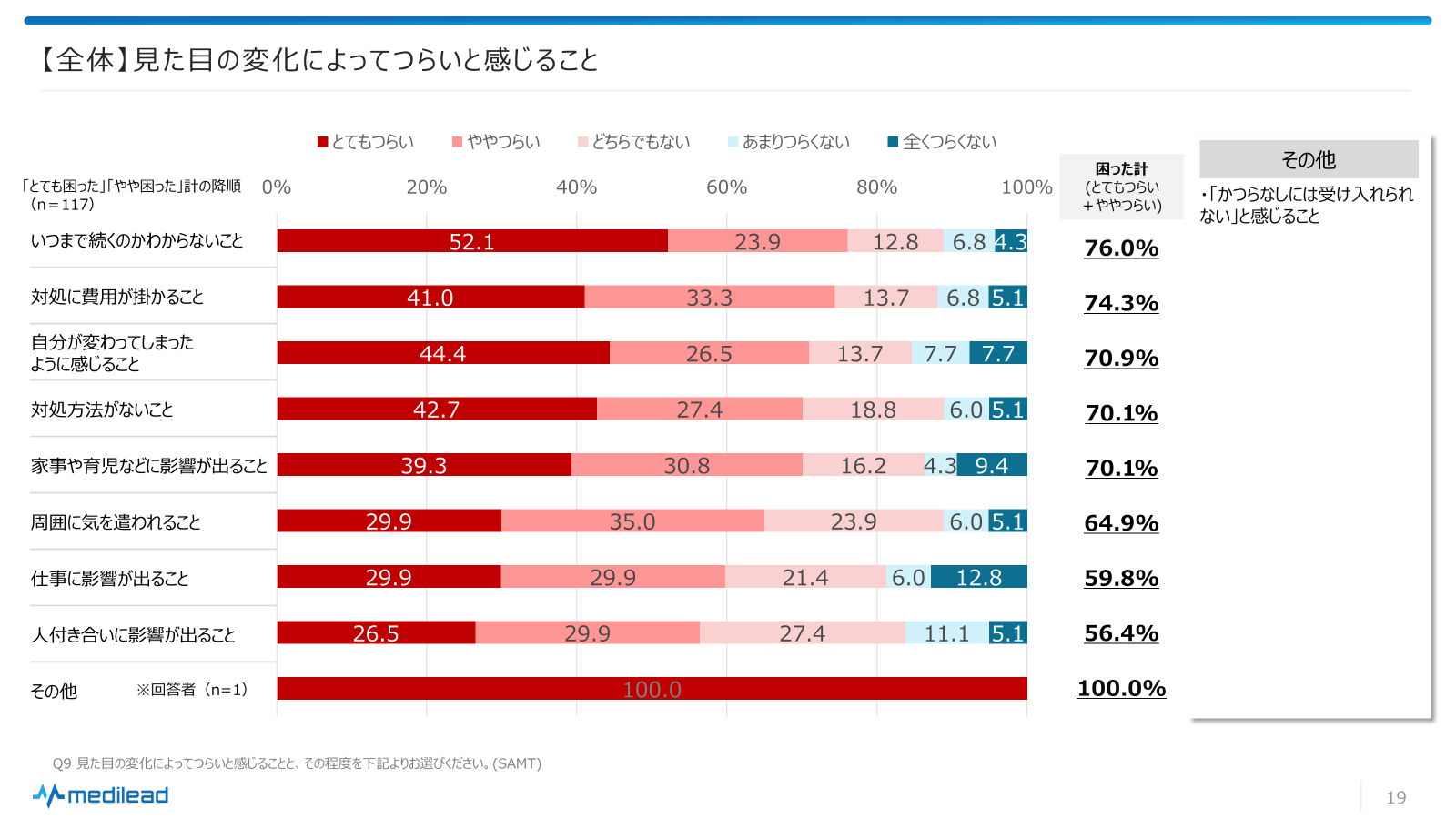 ・見た目の変化によって、つらいと感じること:「いつまで続くのかわからないこと」がつらいと回答した方の合計は76.0%であった。〈図6〉