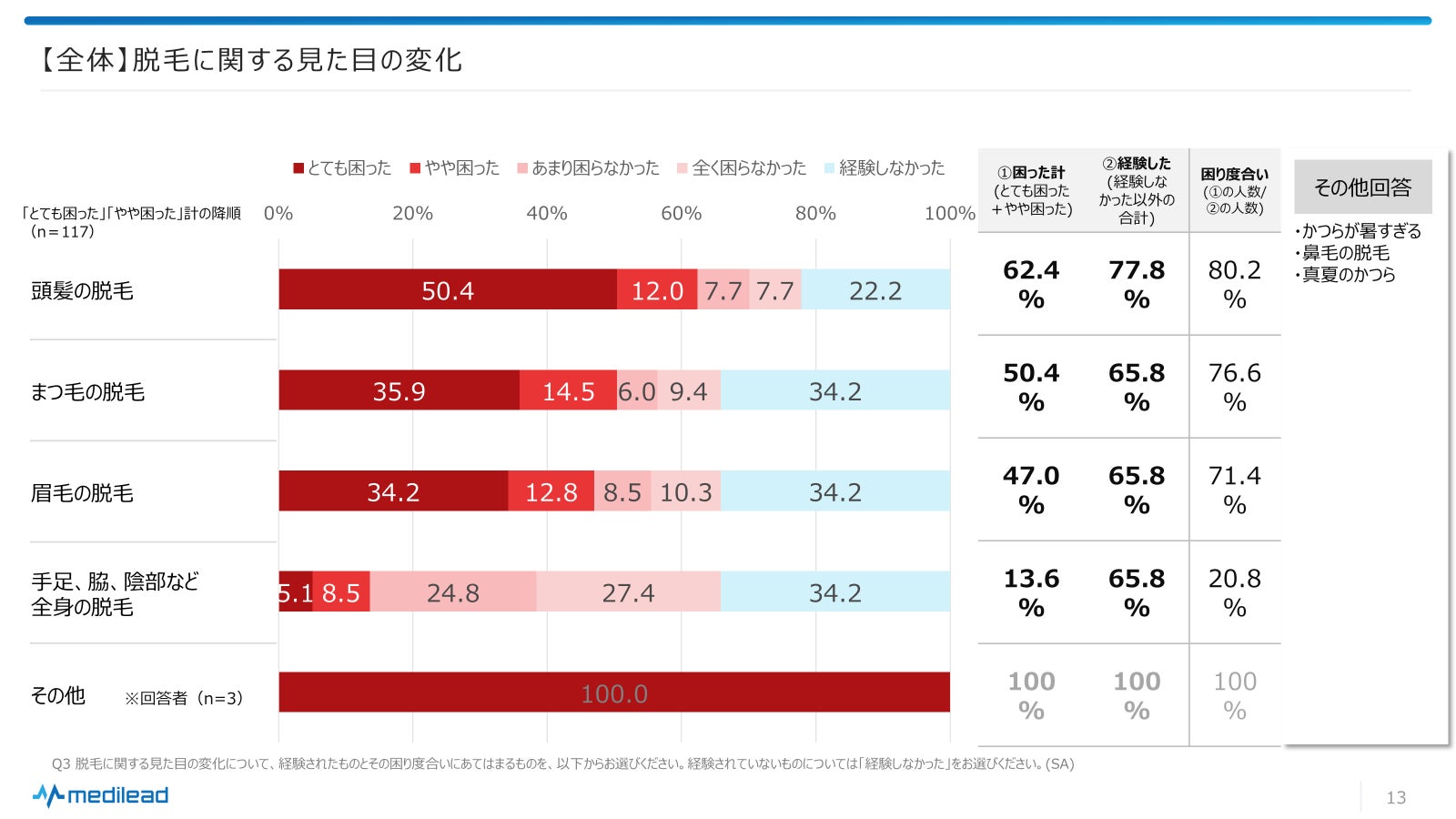 ・脱毛に関する変化:頭髪の脱毛に関する変化は約8割の方が経験していると回答した。〈図5〉