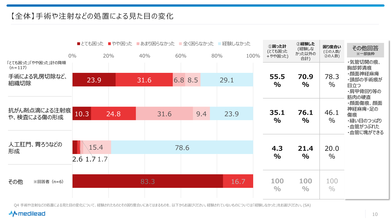 ・手術や注射などの処置による変化:「手術による乳房切除など、組織切除」により「とても困った」、「やや困った」と回答した方は55.5%で、「手術による乳房切除など、組織切除」を経験した方の中で78.3%の方が困っていると回答した。〈図2〉
