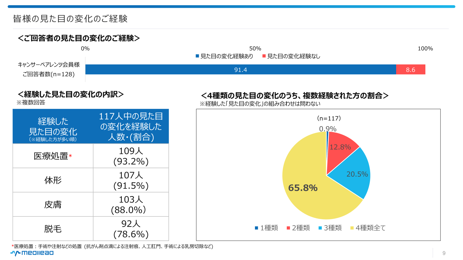 ・見た目の変化を経験した人のうち、変化を感じている箇所として最も割合が高かったのが手術や注射などの医療処置による変化で93.2%、次いで体形(91.5%)、皮膚(88.0%)、脱毛(78.6%)という結果が出た。4種類すべてを経験されている方は65.8%という結果となった。〈図1〉
