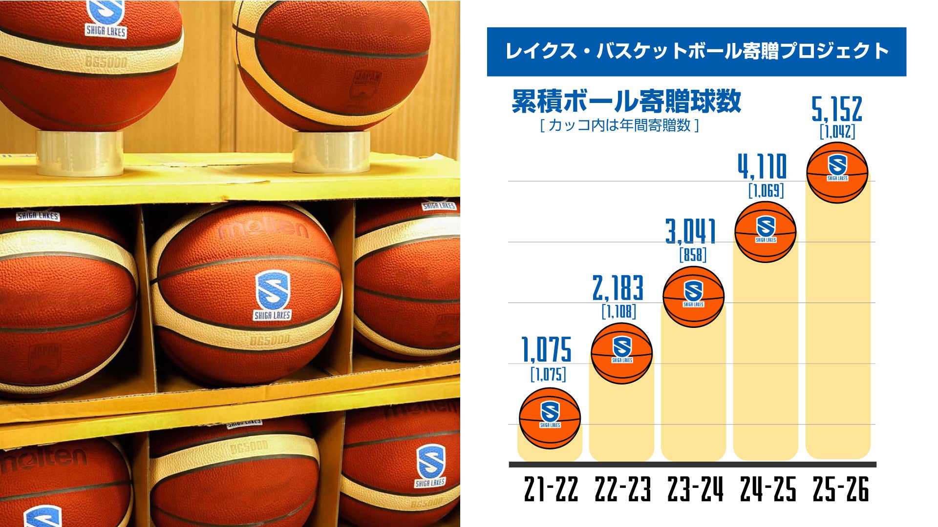 プロバスケットボール「B.LEAGUE」のB1リーグ西地区に所属する滋賀レイクスを運営する株式会社滋賀レイクスターズ(本社・滋賀県大津市、代表取締役社長 原毅人)が滋賀県内の企業・事業所とともに実施している「レイクス・バスケットボール寄贈プロジェクト」による県内の学校へのバスケットボール寄贈数が、2026年3月で5,000球に到達しました。