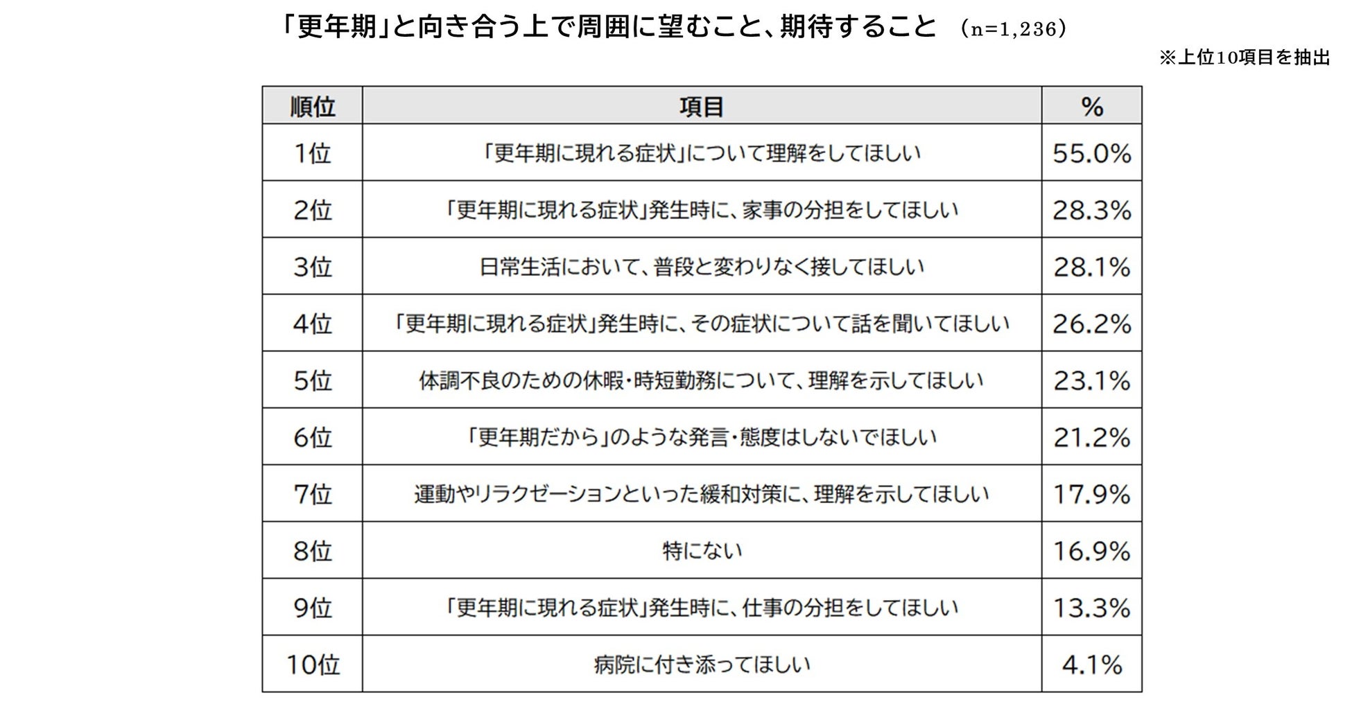 「更年期」と向き合う上で、周囲に望むこと、または期待することについて30代~60代の女性に尋ねたところ、約半数以上の女性が「“更年期に現れる症状”について理解をしてほしい」と回答しました。家事の負担軽減や接し方などの直接的なサポートだけでなく、更年期への理解を求めていることが分かりました。一方「日常生活において、普段と変わりなく接してほしい」(28.1%)と回答した人も一定数存在することから、特別なサポートを求めない人もいることが分かりました。