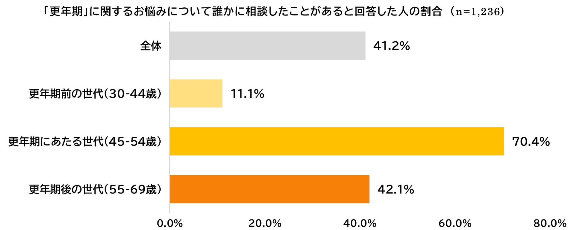 続いて、更年期に関するお悩みを相談したことがあるかと尋ねたところ、30代~60代の女性のうち41.2%が「相談したことがある」と回答しました。