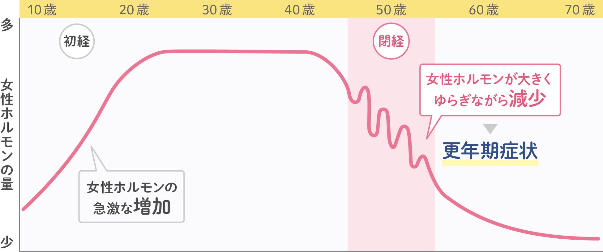 女性ホルモンは、女性の心と体に大きな影響を与えます。一般的には、12歳頃に初経を迎えてから50歳頃までの約40年間、女性ホルモンの周期的な働きによって毎月月経が起こります。この月経が起こらなくなることを「閉経」(※3)といい、この閉経前後の5年間の合計10年間を「更年期」と呼びます。この時期は、女性ホルモンのバランスが不安定となり、身体的、精神的に大きな変化が見られるのです。