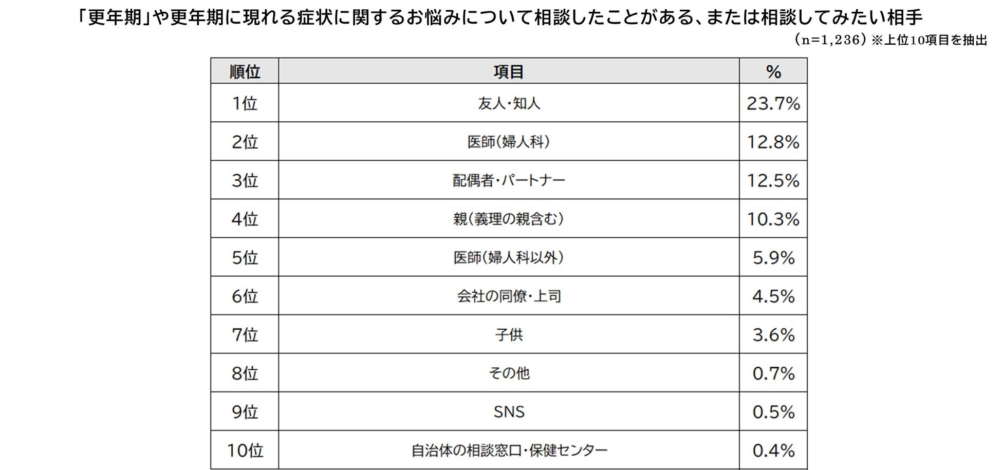 更年期について相談する・相談したい相手について尋ねたところ「友人・知人」(23.7%)が最も多く、次いで「医師(婦人科)」(12.8%)、「配偶者・パートナー」(12.5%)と続くことから、信頼のおける医師だけでなく、友人やパートナーなど、身近な人も相談相手の対象であることが分かります。