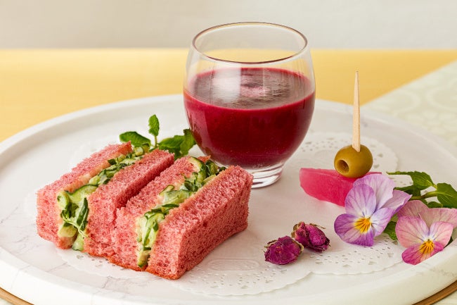 ローズティーのような、鮮やかなピンク色のサンドイッチ。ビーツやラズベリーを練りこんだヴィーガンブレッドに、キュウリとソイマヨネーズをサンドしています。