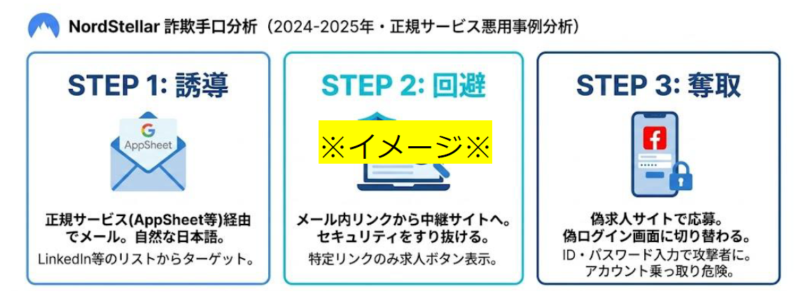 本調査では、Meta、Disney、Coca-Cola、Spotifyなどの著名企業の採用担当者を装ったメールを起点に、本物と見分けがつかない偽求人サイトへ誘導し、最終的にFacebookアカウントを乗っ取る多段階型の攻撃の実態が明らかになっています。こうした手口は世界的に確認されており、日本の求職者にも広がる可能性があります。