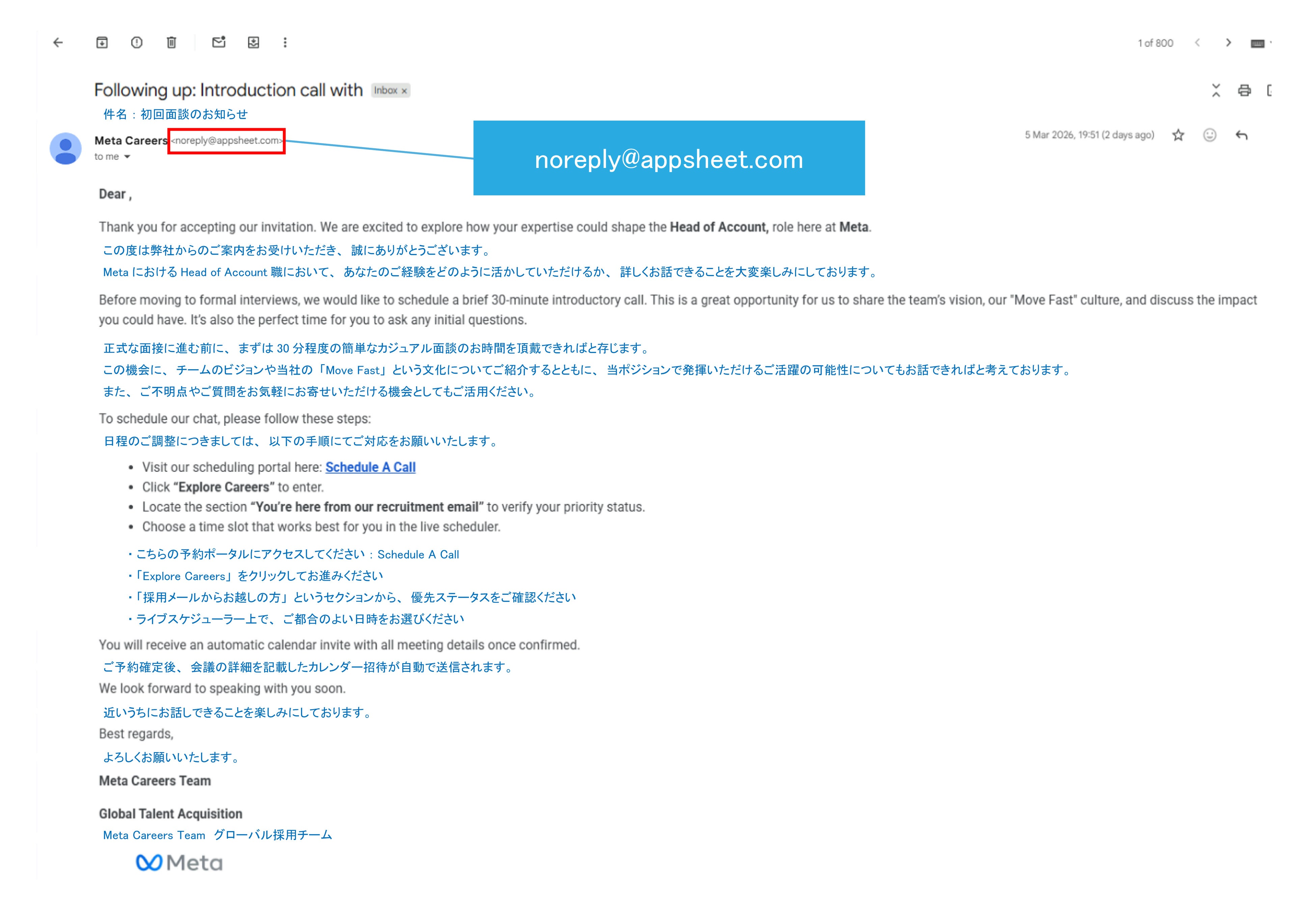 詐欺はGoogle AppSheetなど正規サービスを経由して送られてくる採用メールから始まります。文面は自然な日本語で書かれており、実際の採用連絡と見分けがつきません。AppSheetとはGoogleが提供する正規のサービスであるため、送信元アドレスが「appsheet.com」となり、スパムフィルターに検知されにくく、受信者も疑いを持ちにくい点が悪用されています。