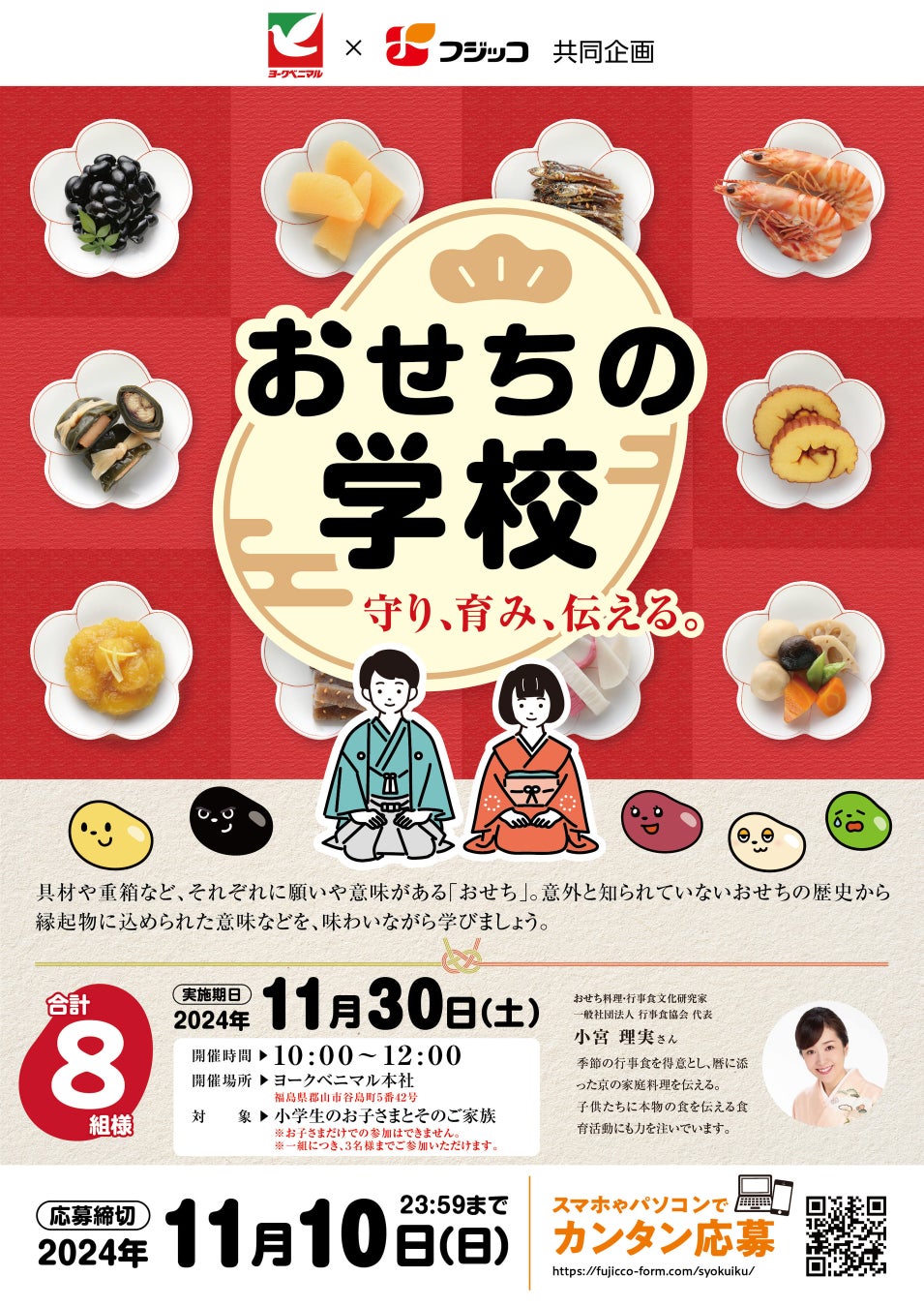 フジッコ株式会社(本社:神戸市中央区/代表取締役社長執行役員:福井正一)は、株式会社ヨークベニマル(本社:福島県郡山市/代表取締役社長:大髙耕一路)と協同で、2024年11月30日(土)に親子等8組様をご招待し、ヨークベニマル本社テストキッチンにて、日本のおせち文化を「守り、育み、伝える。」ことを目的とした「おせちの学校」を開催いたします。