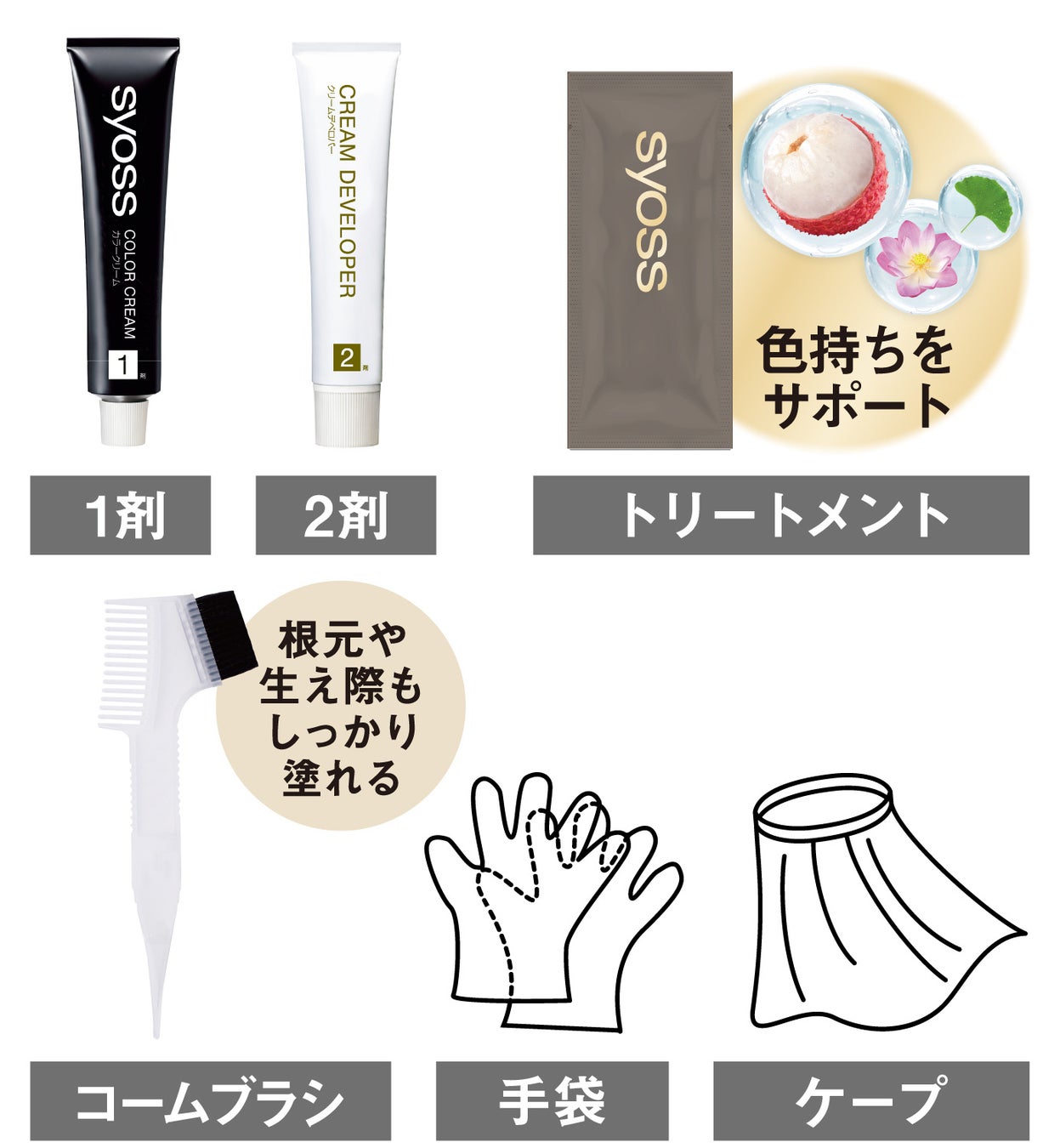 内容物:1剤50g、2剤50g/アフターカラートリートメント 15g、ケープ、手袋、コーム、トレー