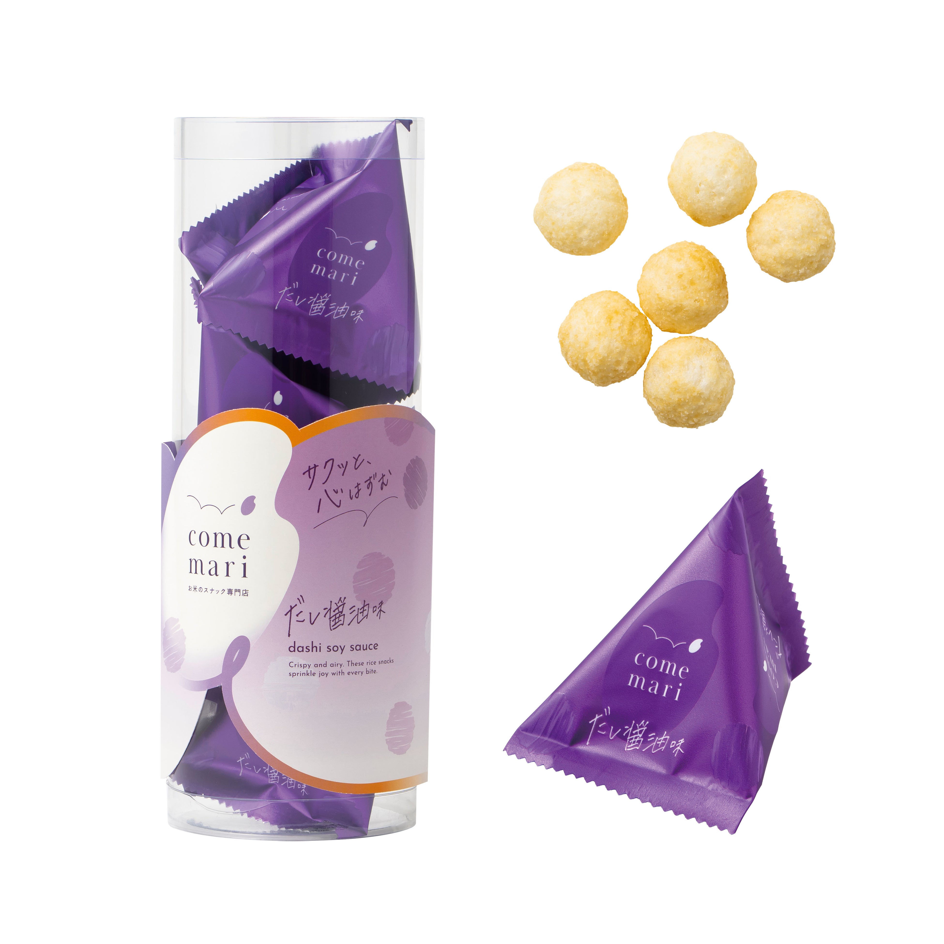 国産うるち米を100%使用した、軽やかでサックサクの食感に、コロコロと転がる“鞠”を思わせる、見た目にも愛らしい小粒なサイズ感。選ぶ時間まで楽しくなるフレーバーラインナップや、気分を明るく彩るカラフルな個包装が覗く透明パッケージにも、「comemari(こめまり)」ならではのこだわりを込めました。