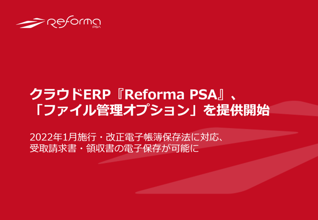クラウドERP『Reforma PSA(レフォルマ ピーエスエー、以下「Reforma」)』を提供する株式会社オロ(本社:東京都目黒区、代表取締役社長:川田 篤、以下「オロ」)は、2022年8月にReformaの新オプション「ファイル管理オプション」を提供開始することをお知らせいたします。2022年1月より施行された改正電子帳簿保存法(以下、改正電帳法)への対応として、受取請求書と領収書をReformaで電子保存可能となります。