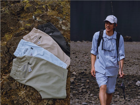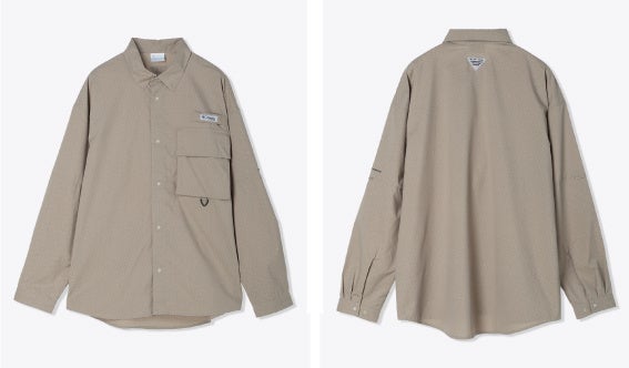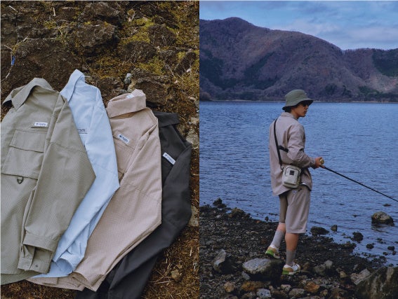 第2弾コラボレーションとなる今回は夏のフィッシングシーンはもちろんのこと、デイリーユースでも活躍するベーシックなデザインで汎用性の高いロングスリーブシャツとセットアップコーディネートできるショートパンツの2型を展開。Columbia PFGを象徴するフィッシングディテールの胸元のロッドホルダーや、袖を捲ってキャストした際にズレ落ちるのを防ぐロールアップベルトを採用、胸ポケット下部にDリングをつけてフィッシングツールを吊り下げられたりと実用面が充実。襟元はスタンドネックにして防風性を高めることもでき、フロントボタンもスナップボタンを使うことで容易に着脱できる仕様に設計しました。