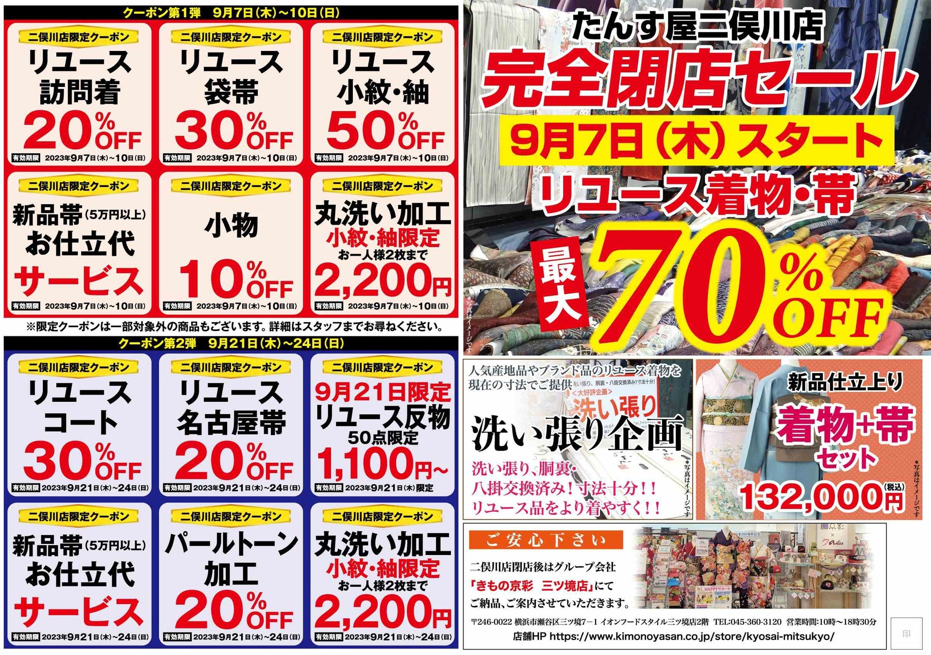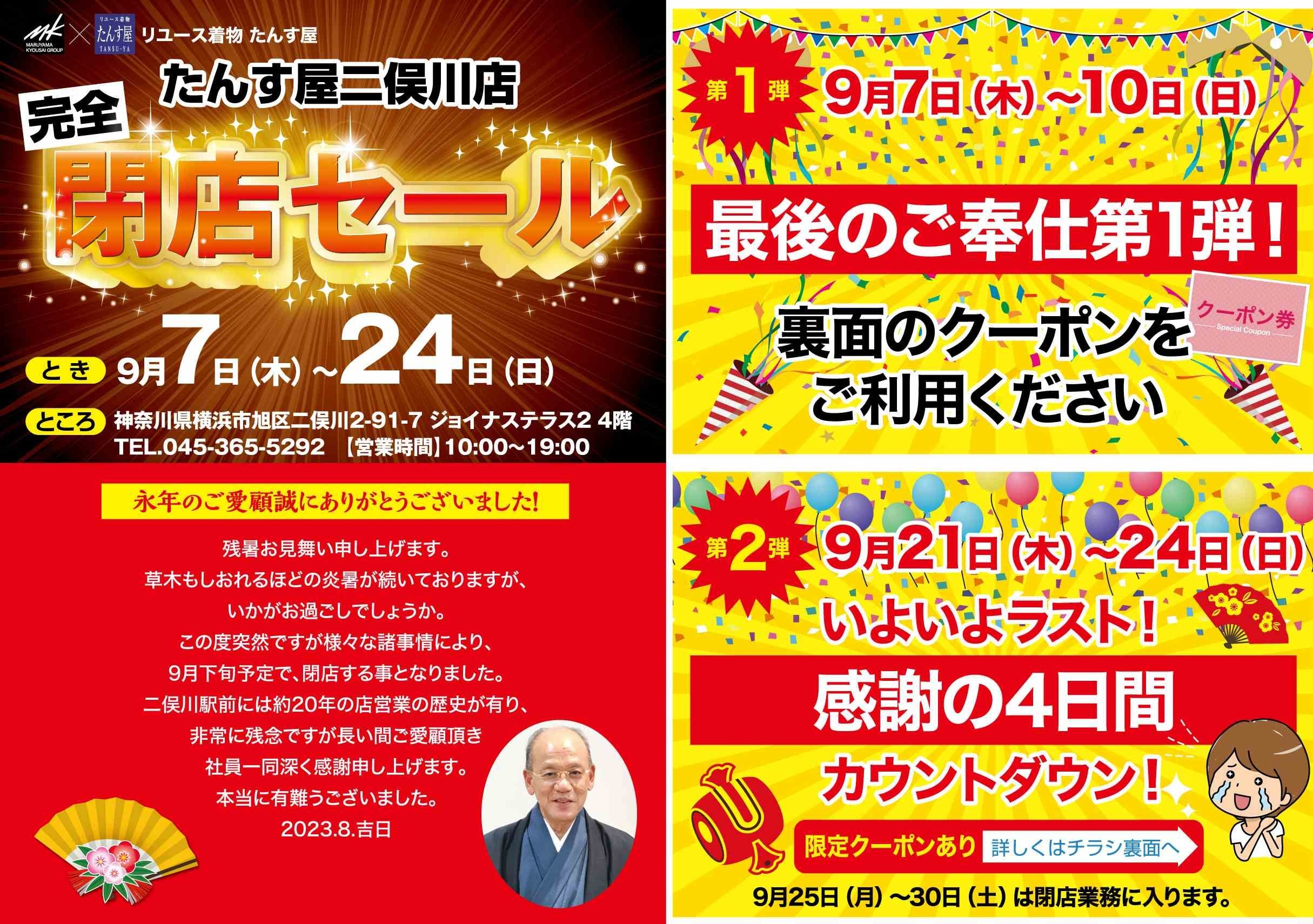 約20年営業を続けてまいりました「たんす屋ジョイナステラス二俣川店」が、2023年9月で閉店となります。そこで、これまでの感謝として2023年9月7日(木)~24日(日)の期間「完全 閉店セール」を催します。最後のご奉仕させていただきます。