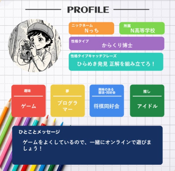 性格診断の結果をもとに情報を入力すると、AIが「オリジナル自己紹介シート」と「アイコン画像」を生成します。生成されたシートは学園のコミュニケーションツール「Slack」やSNSにそのまま活用が可能。個人が特定されるような情報を含まない安全な設計で、オンライン交流のきっかけ作りに役立ちます。