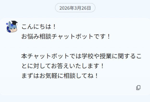 入学時によくある質問や新生活の悩みに答えるAIチャットボットを設置。適切な情報や問い合わせ先を案内します。入力内容は蓄積されず完全に削除される仕様のため、安心して相談することができます。