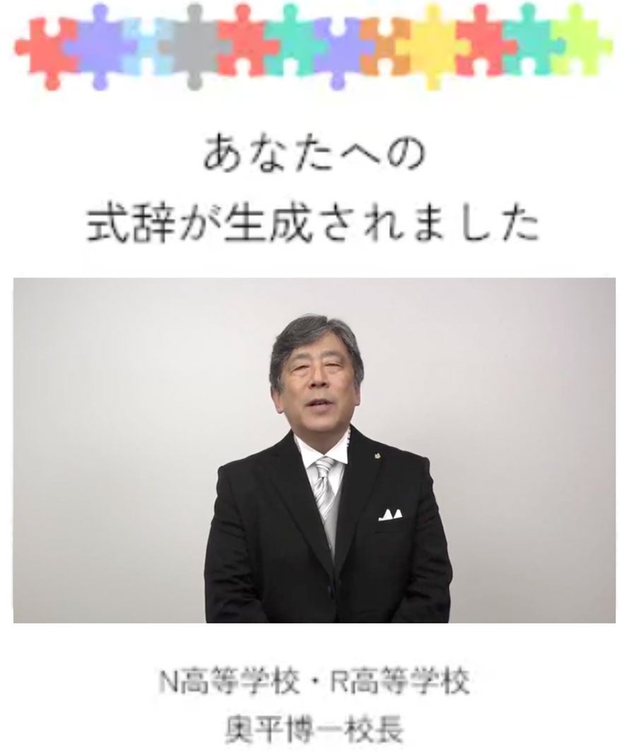 これまで頑張ってきたことやこれから挑戦したいことを入力すると、AIが生徒一人ひとりにカスタマイズされた「オリジナルの学校長式辞」を自動生成します。生成された式辞は奥平博一校長(N高等学校・R高等学校)の声と生成動画で読み上げられ、自分だけの特別なエールを受け取ることができます。