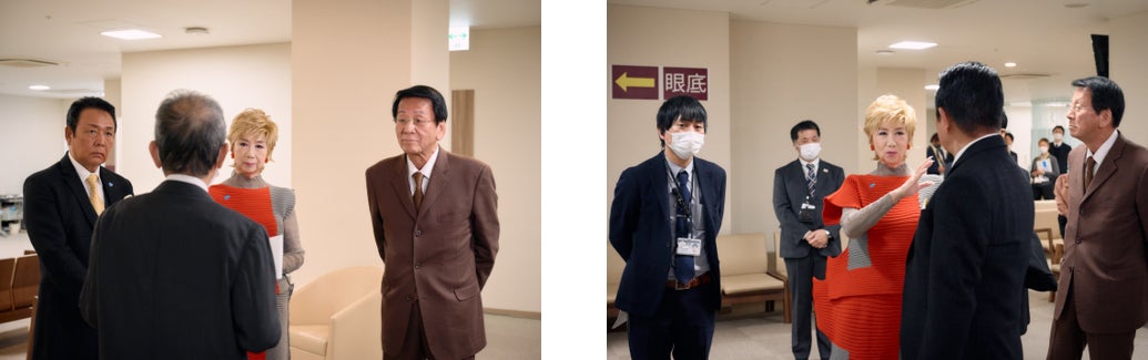 杉良太郎氏、瀬川瑛子氏、山本譲二氏がマツダ病院の健診センターを訪れ、病院長の田村徹氏と健診事務リーダーの森康晴氏より施設や事業の説明を受けました。